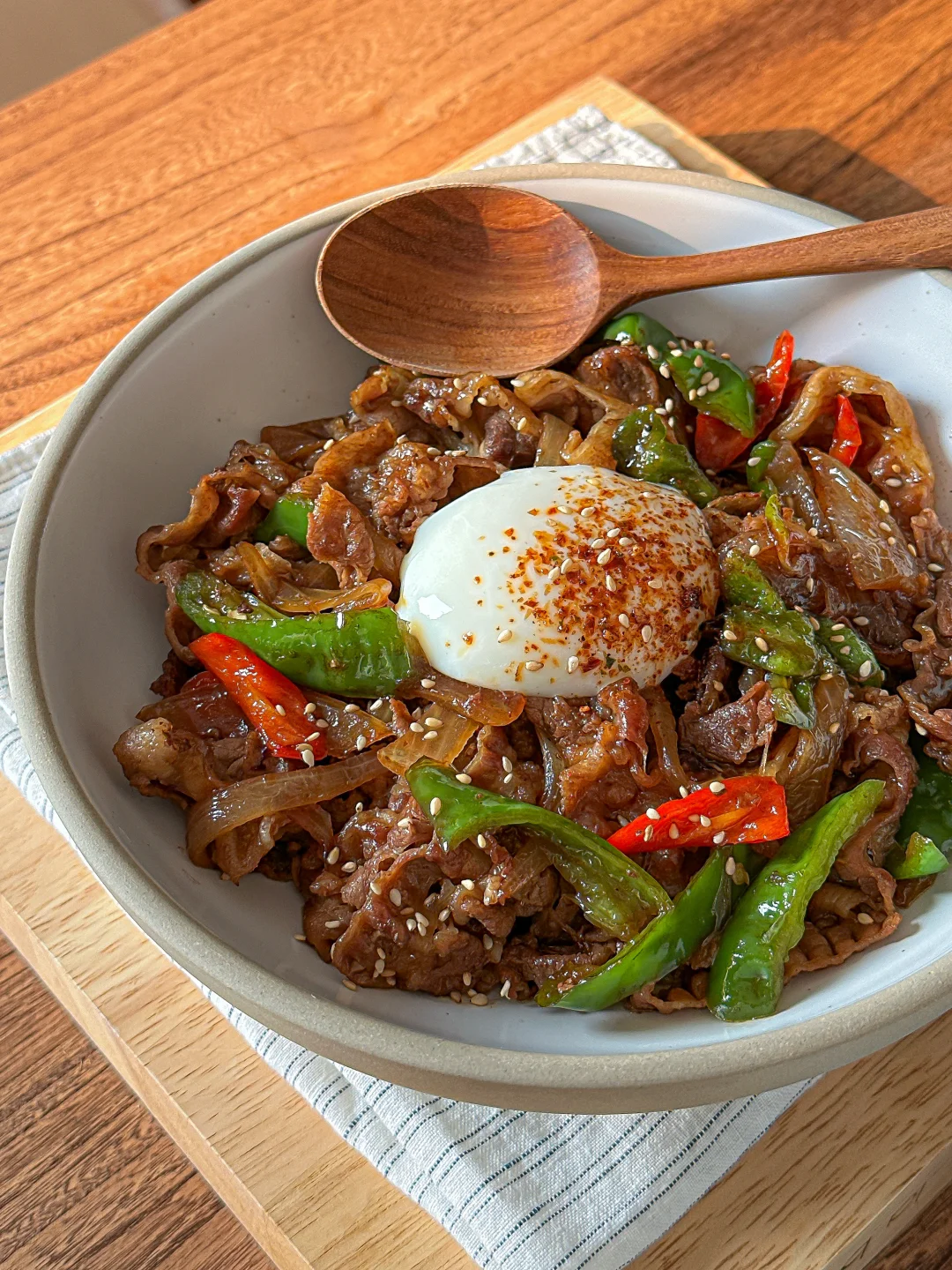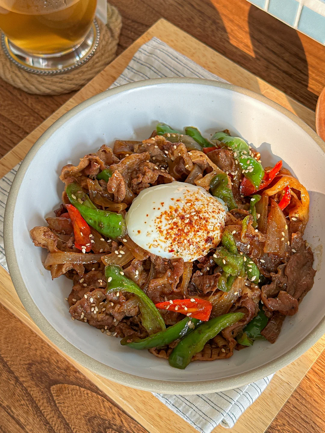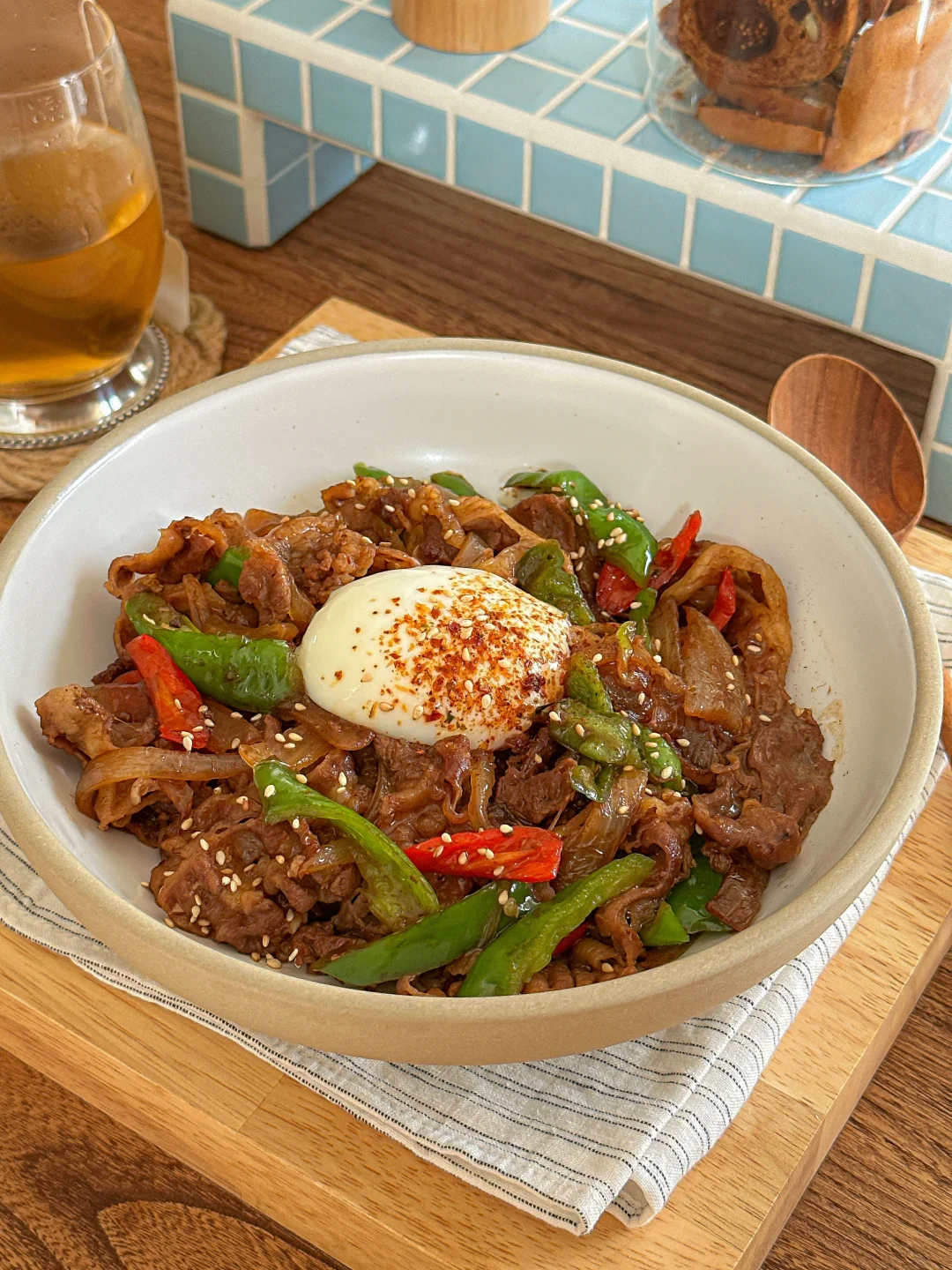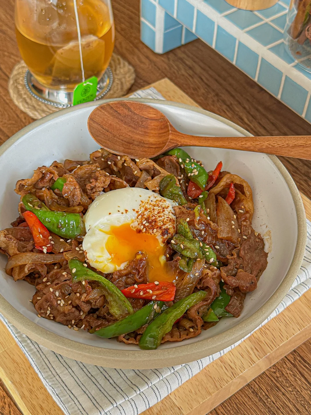 比吉野家还好吃的双椒照烧肥牛饭! 微辣的口感每一口都很过瘾 越吃越上头~ 强推的的做法 👍 - 多汁的肥牛+溏心蛋 拌在一起超绝饭张力! 搭配玉米须茶🍵 低卡美味 好吃好喜欢😋