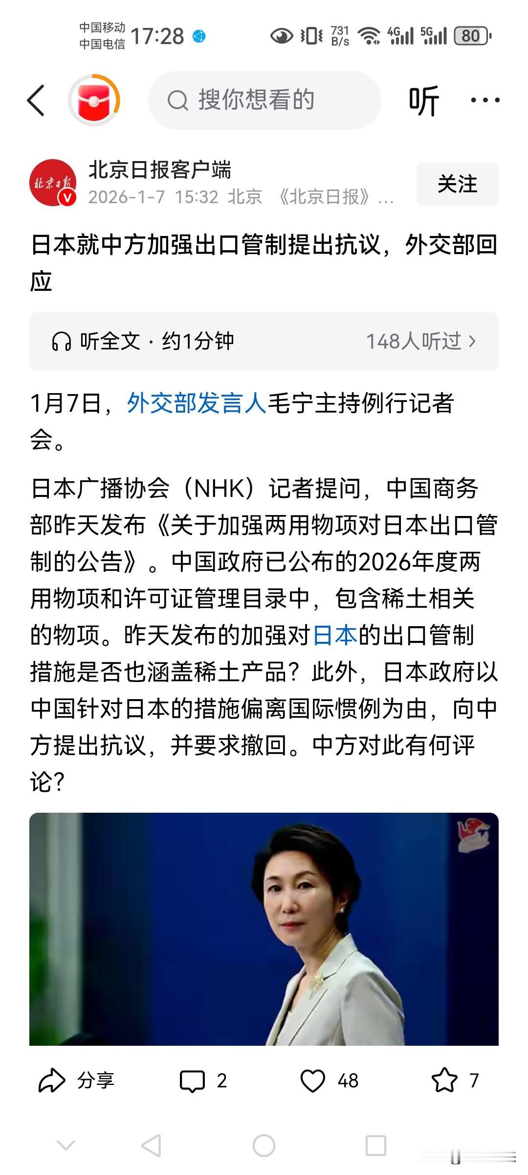 中国商务部的两项物项对日本出口管制,直接让日本猝不及防,直接崩溃(包括稀土)。 俗话说的好:打蛇打七寸,釜底抽薪一招制敌! 日本政府向中国政府的两项物项出口管制提出抗议,外交部直接驳回! 日本政府这下慌了,着急了,晚了! 人在做天在看,不是不报而是时候未到! 日本这个国家矿产资源稀少,重要战略物质和两用物项全部依赖进口,中国又是主要出口国,这次直接让日本破防了! 知错不改,惩罚加倍!