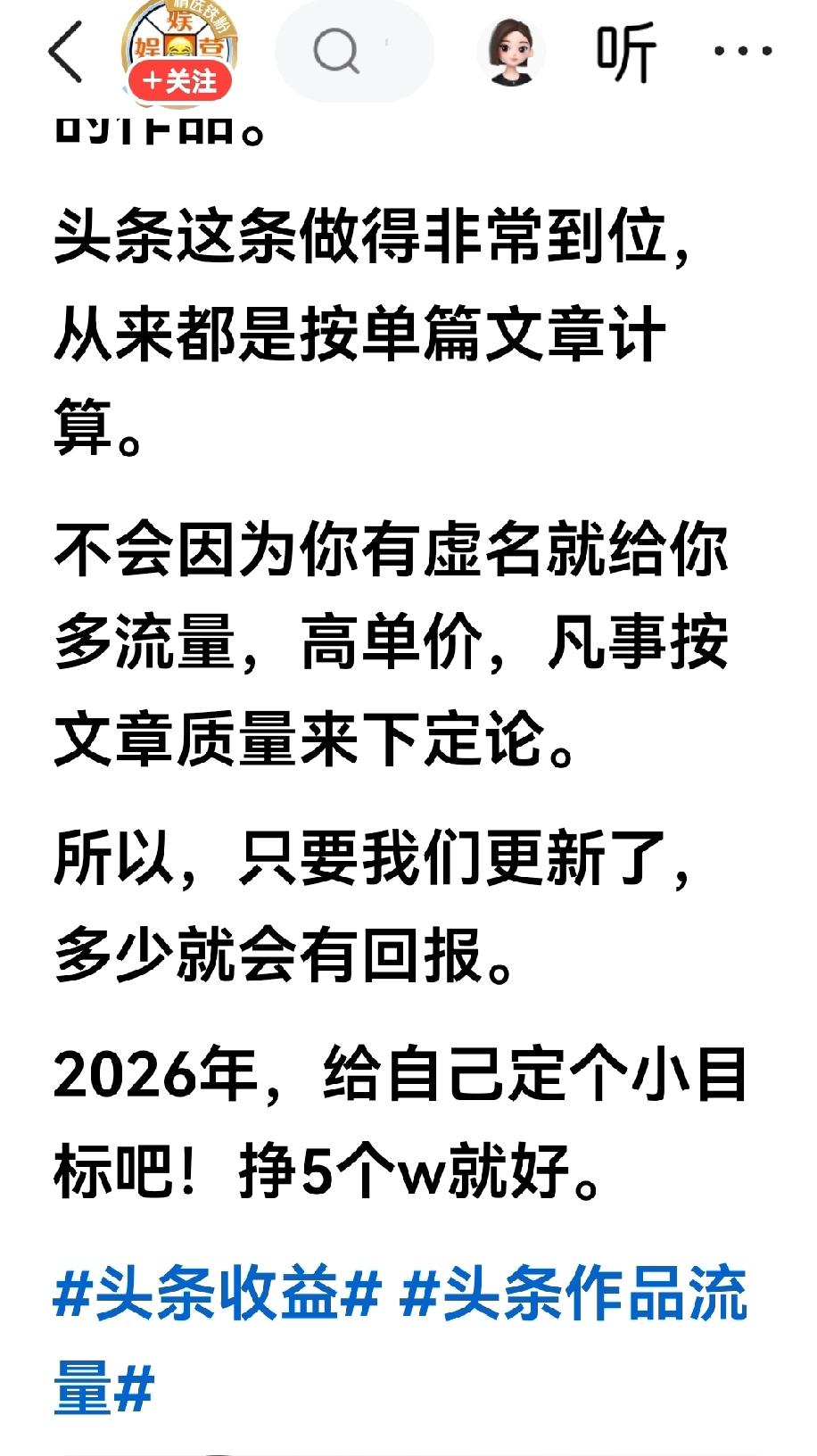 刚刚刷到“娱乐营”的一篇微文,他昨日的收入是328元,可能超过了素老三的微文收入。 “娱乐营”的这篇微文,其昨日328元收益其实不是亮点,他的结尾有亮点,他说他也没啥大志向,他只是计划在2026年的一年里、在头条挣上5个w。 娱乐营说他昨日的阅读总量是17.9万,阅读单价是1.83元,这样的单价是亮点,但这不是这篇微文的最大亮点。 其实娱乐营这篇微文的最大亮点是中间部分,他竟然提出了在头条上创作的新观点,其新观点令人耳目一新,但又觉得合情合理,大家不用着急,让我细细道来! 娱乐营说由于元旦的原因,他没有发文,头条取消了他的新锐创作者称号,当时有些不乐意,不过他继续坚持发文,他的流量并没有减少,前几天他的收入是两位数,而昨日他的展现量猛增,阅读量达到了近20万,所以昨天的收益最高,差不多要突破400元了。 这时娱乐营认为头条创作者的收益与头衔无关,这就为广大创作者因为头衔的问题解开了疑惑。 另外他还通过总结得出另一个结论,他认为现在的头条收益多少与账号无关,头条的收益只与单篇作品的质量有关,头条给创作者的报酬是由单篇作品来决定的! 友友们!看到了娱乐营这样的收益新观点,大家有什么想法?另外新的一年里,大家作为创作者,有没有自己的一个小目标呢?