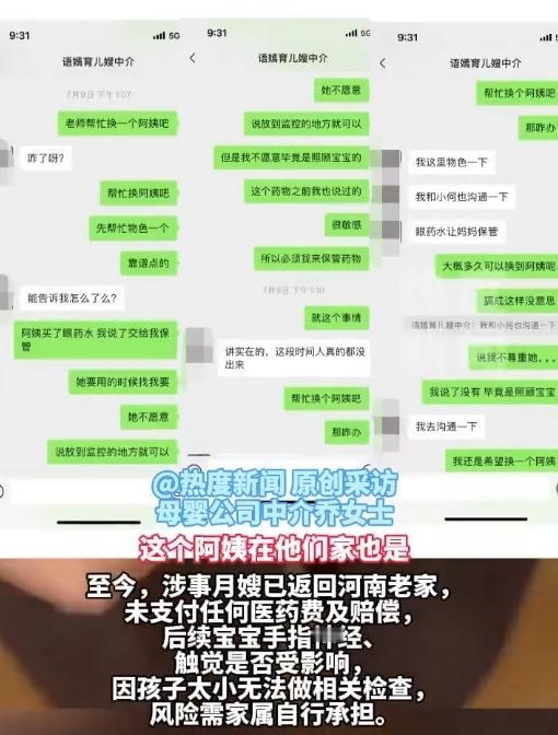 看看新闻客户端曝光!上海月嫂伤婴血案细节炸裂 上海惊现月嫂伤婴血案!@看看新闻客户端记者调查发现,9月龄宝宝被月嫂用药品切割器割破手指,血流不止!监控画面令人窒息—— 月嫂竟拿凶器逗娃 2025年7月,刘女士家中监控记录下惊悚一幕:月嫂骑着扭扭车带娃进入盲区,突然传来"打开我把你手夹住好不好"的诡异笑声。就在刘女士提醒"小心刀片"时,宝宝撕心裂肺的哭声刺破空气! 血染急诊室的下午 送医途中,宝宝的衣服、尿不湿全被鲜血浸透。上海儿童医学中心医生摇头:"伤口太深无法缝针,相当于指甲被生生劈开!"按压止血持续3小时,家长心疼到崩溃。 家政公司连环坑 更令人胆寒的是:涉事月嫂曾私购药品遭投诉,家政公司竟拒绝更换!后续派来的"金牌月嫂"被前雇主全网避雷,体检报告显示心电图异常(不适合熬夜),最终确诊人乳头瘤病毒雇主! "她们把我们当试验品!"刘女士晒出聊天记录,中介竟称"人乳头瘤病毒不影响带娃"。目前涉事公司已被立案调查,家长索赔50万元精神损失费。 你敢把孩子交给这样的家政公司吗?评论区分享你的月嫂糟心事,点赞为宝宝祈福,转发曝光黑心家政!