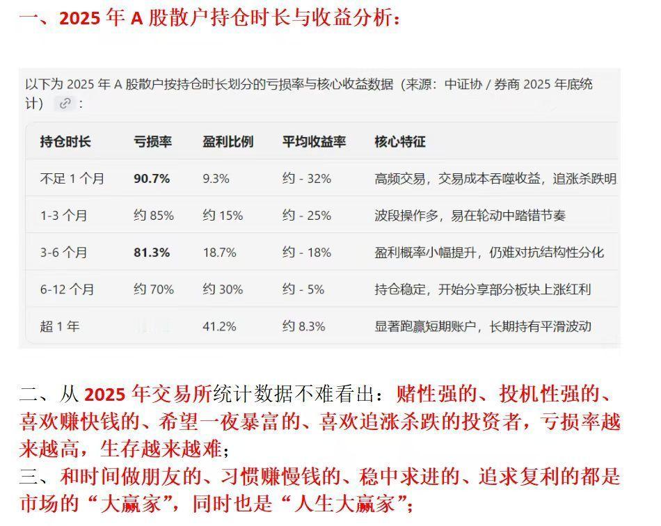 上善若水点方圆 3 2026-01-08 22:16 证券账户显示百分之60多的人赚钱,百分之30多亏钱。结合大盘涨了一年。我觉得这数据合理。如果按作者的统计,牛市尚且如此,熊市那么多年,散户早死绝了。怎么可能现在还有两亿多股民。