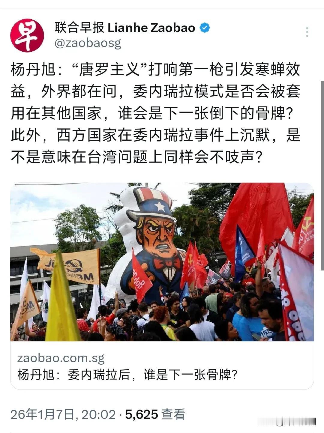 新加坡联合早报今晚(1月7日晚)发表杨丹旭的评论称:“‘门罗主义’打响第一枪引发寒蝉效益,外界都在问,委内瑞拉模式是否会被套用在其他国家,谁会是下一张倒下的骨牌?此外,西方国家在委内瑞拉事件上沉默,是不是意味在台湾问题上同样会不吱声?” 评几句: 杨丹旭的疑问看似切中热点,实则混淆了本质区别。“门罗主义” 本质是美国包装霸权、干涉他国内政的工具,突袭委内瑞拉是赤裸裸的主权侵犯;而台湾问题是中国内政,两者在性质上毫无可比性,根本不存在所谓“模式套用”的可能。 内政红线碰不得,霸权套路行不通。西方国家对委内瑞拉事件的沉默,不过是怕得罪美国的利益算计,并非什么“立场一致”。但台海问题涉及中国核心利益,台湾问题纯属中国内政,任何外部势力无权干涉。从常态化台海巡航到坚定反制外部干涉,中国维护主权的行动从不含糊,解放军的捍卫决心与实力,绝非委内瑞拉可比,西方若敢插手,必将付出无法承受的代价。 别被霸权逻辑带偏,更别误判中国维护领土完整的底线。台湾不是任人拿捏的“骨牌”,任何将台海与他国事态捆绑的论调,都低估了中国的决心——分裂势力与外部干涉,终将被历史发展的大势所摒弃。