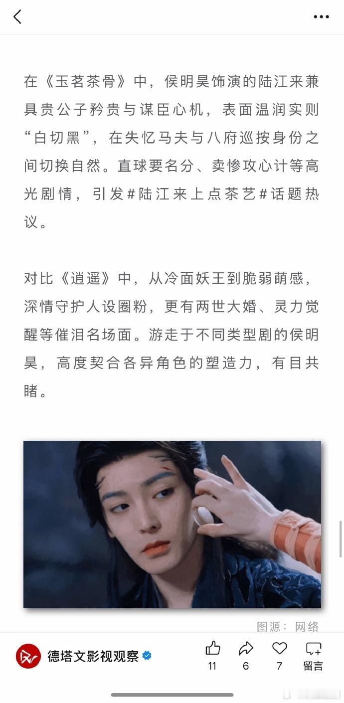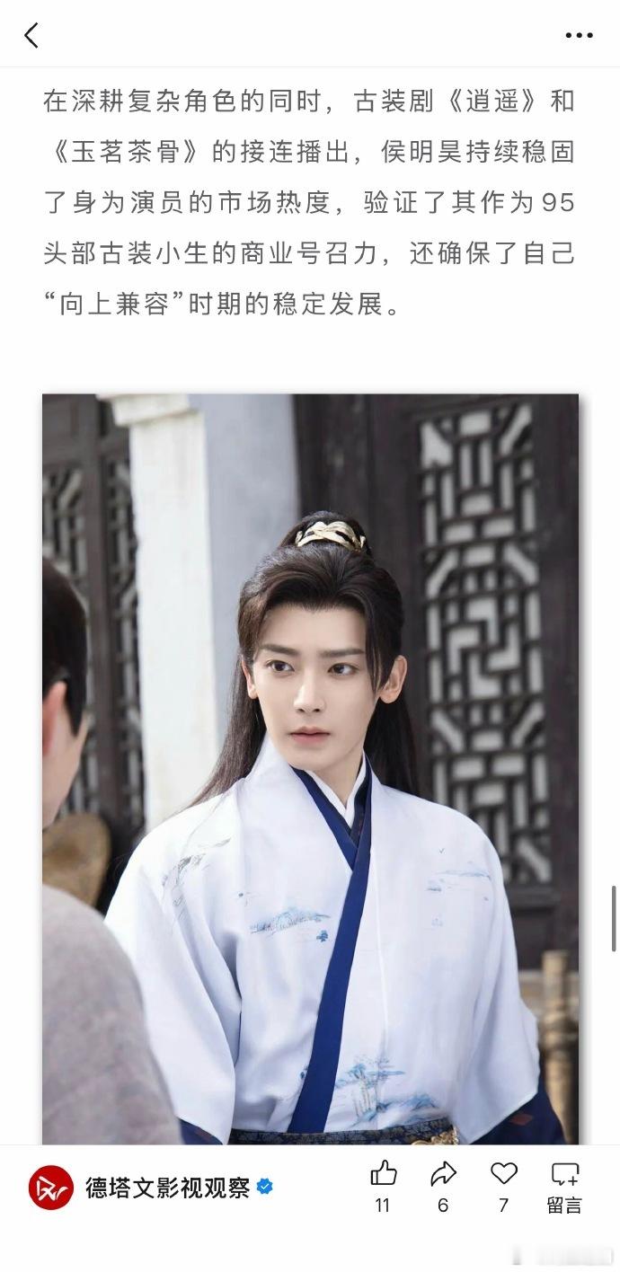 德塔文发文:95实力小生侯明昊“向上兼容”,落地演绎《逍遥》三世情缘;三世情缘