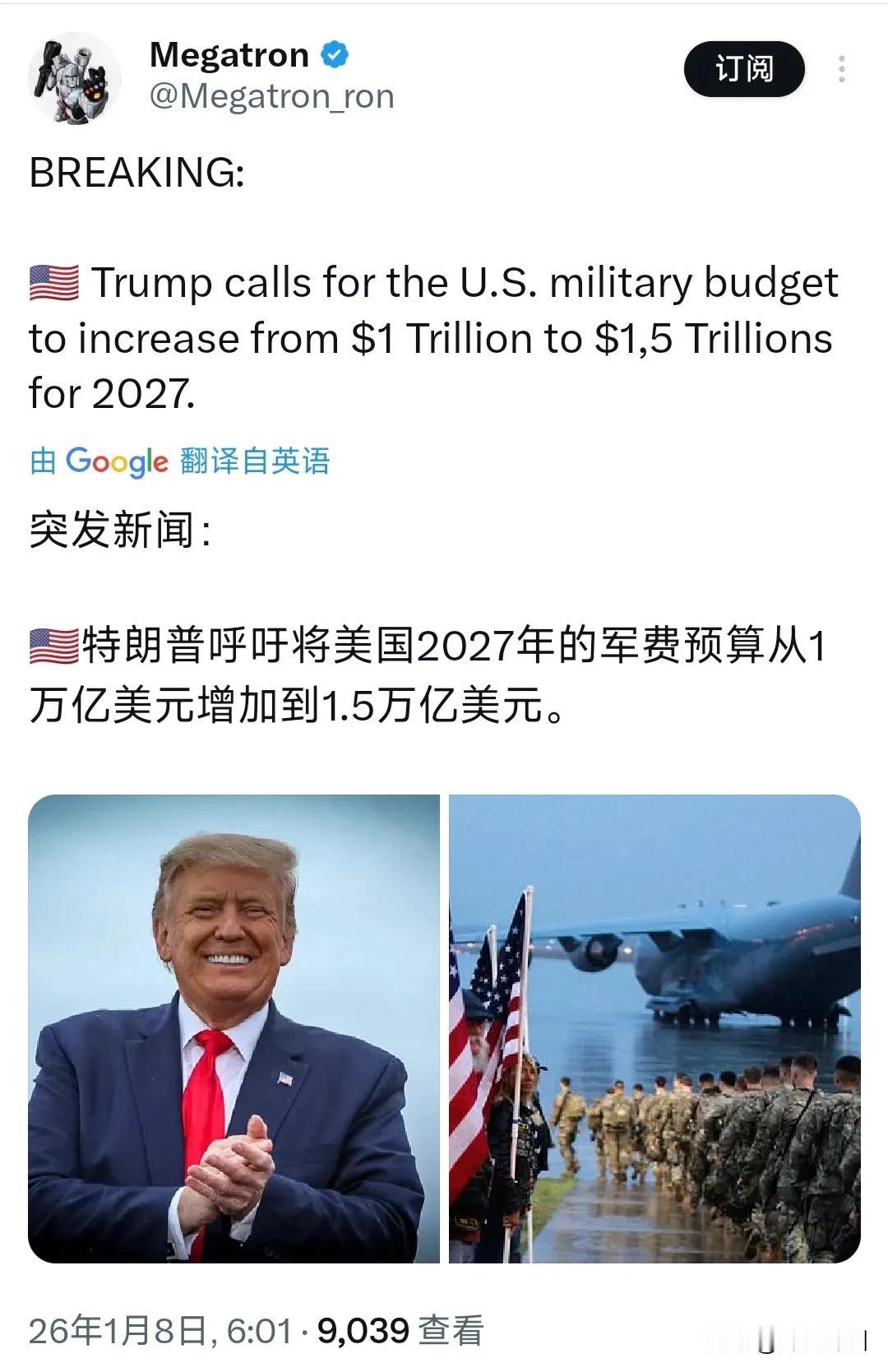 突发新闻:特朗普呼吁将美国2027年的军费预算从1万亿美元增加到1.5万亿美元。 评几句: 特朗普突然喊出要把2027年美国军费从1万亿加码到1.5万亿美元,这哪是扩军,分明是拿全球安全当赌注的霸权豪赌! 要知道,美国军费的疯狂飙升,本质就是霸权思维的极致体现。特朗普嘴硬说靠关税收入,可美国国债早已突破38.5万亿,每年债务利息就快赶上万亿军费,本质就是透支未来、挤压民生的寅吃卯粮。再看钱要怎么造?美军采购效率持续下滑,F-35战机成本飙涨,五角大楼连续七年审计不过关,上千亿开支说不清去向,这笔巨款只会让军工复合体赚得盆满钵满。 更危险的是全球影响!美国军费本就占全球40%,再大幅加码只会引发连锁军备竞赛。 日本已跟风将2026财年军费提至9.04万亿日元,2027年将突破10万亿日元,还在采购1000公里射程导弹、研发高超音速武器;德国也同步增加防务开支,世界正被拖入阵营对抗的险境。所谓“强化安全”不过是借口,真实目的是靠军事霸权维系单极秩序,牺牲他国安全换自身绝对优势。