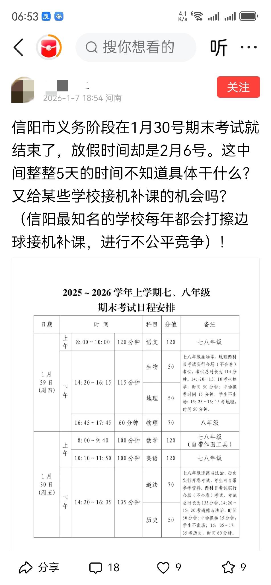 最近在网上看过好多投诉或吐槽内容,集中在医疗,教育领域。也许是我这些天比较关注医疗和教育吧,我看到的内容也以这两个领域为主。 我认为这些投诉分为三类,一类纯粹是坏,自己目的达不到就投诉。一个中年男子,他父亲在药房买完药去退,药房不给退,他就无中生有去投诉。好在药房做的合规,市场监管部门不和稀泥,带着他现场共同查看他认为有问题的,结果一一打脸。 一类是自己认为自己有理,投诉后发现自己错了,公开道歉。这一类投诉或者吐槽,是信息不对称造成的,当他自己查询或得到解释后,能认识到是自己的错,及时道歉,公开道歉。这一类投诉,被投诉的和投诉的,最后都会满意,也会让类似投诉少一点。 第三类,我觉得就属于揣着明白装糊涂了。比如这个投诉,一个爱思考的,教育博主,头条内容品鉴官,按理来说具有独立思辨能力吧。他吐槽什么,吐槽教育部门考试后和真正放假时间竟然要间隔 5 天,这 5 天是干什么的?这 5 天是教育部门让培训机构用来违规招生的。 我想上过学的都知道,学生考完试,老师是不是要批改试卷,统计分数,这些不需要时间?哪一次是这边考完,立马放假的? 作为爱思考的,教育类博主,内容品鉴官,他能不懂这个? 是懂装不懂!