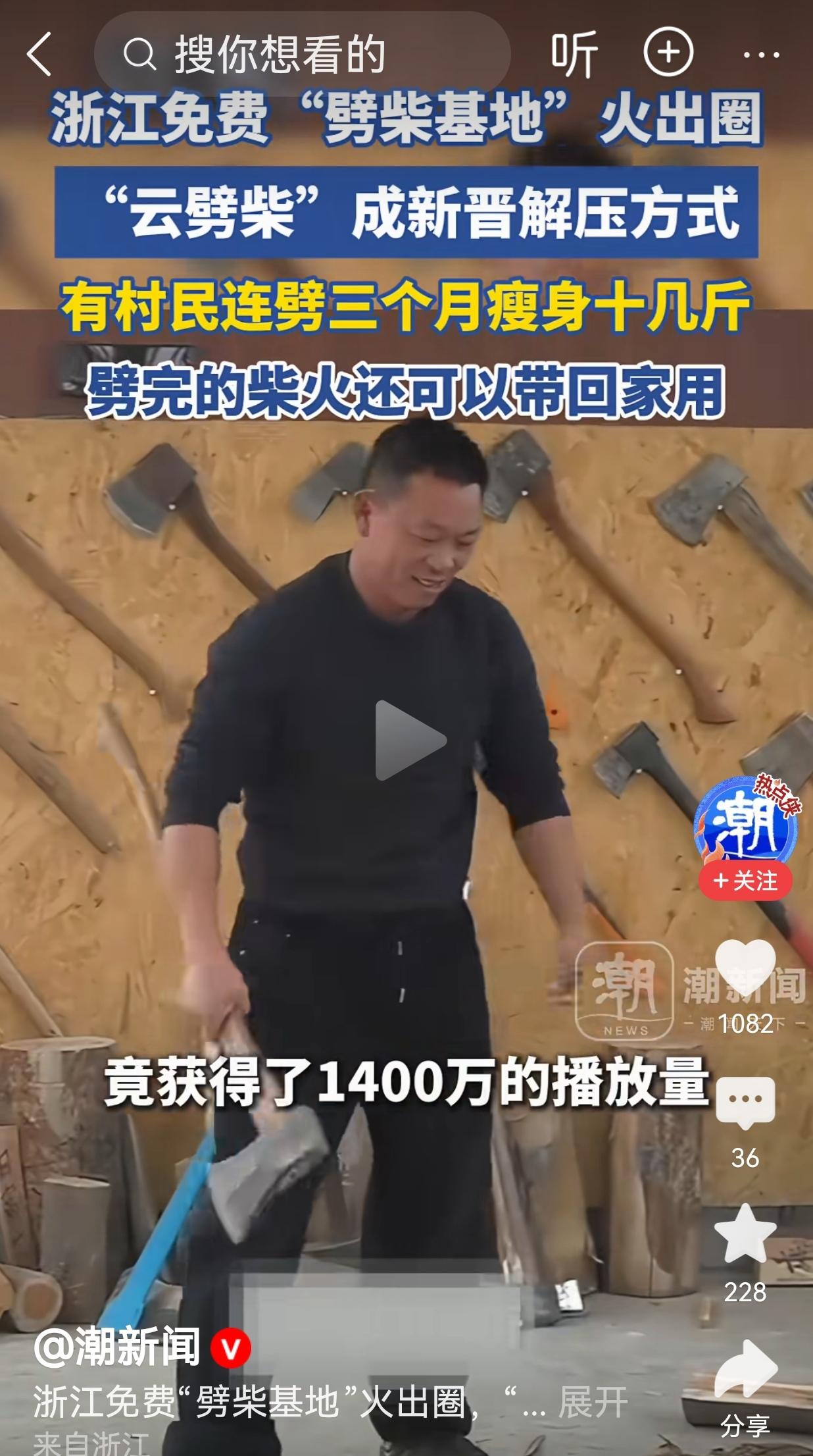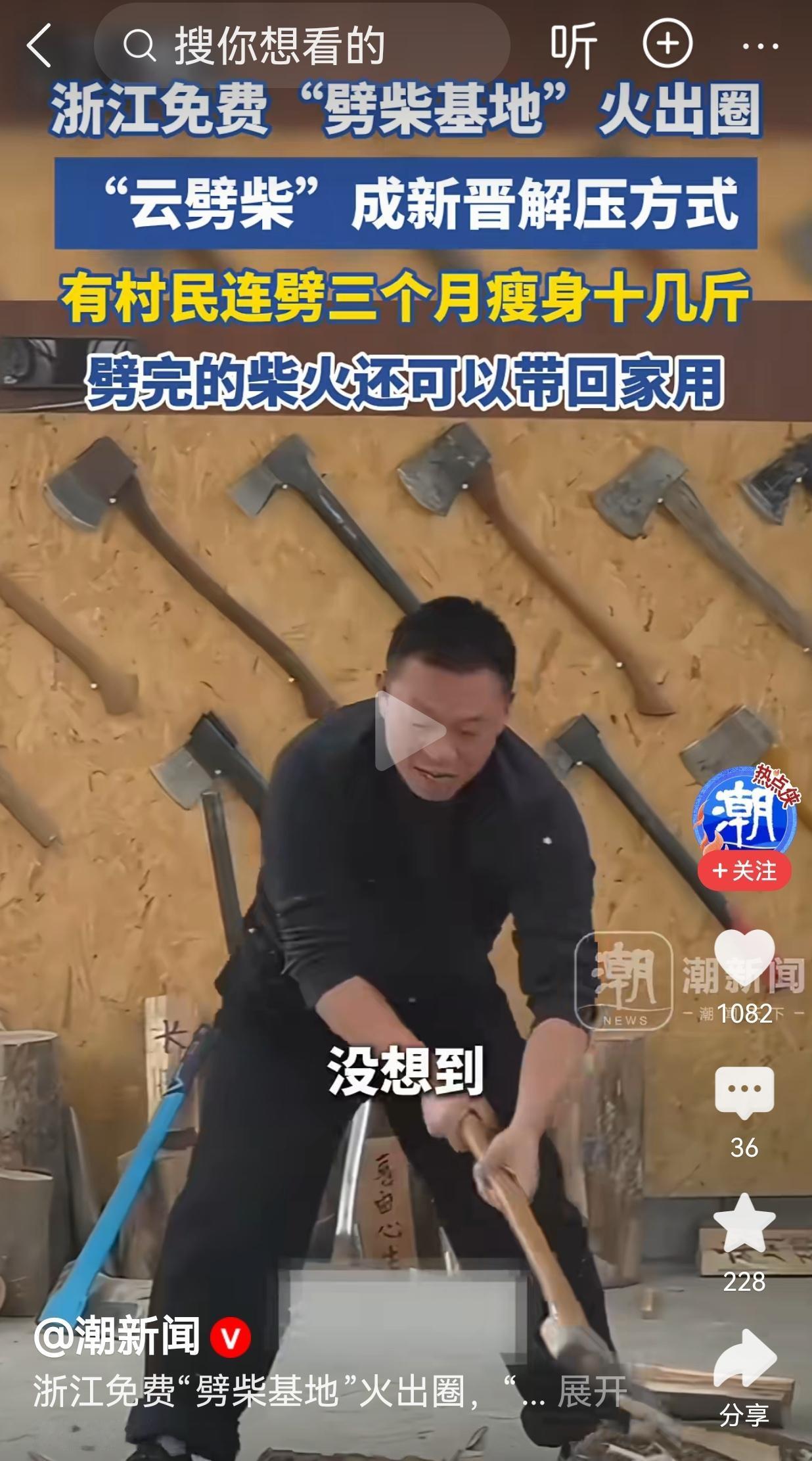 最近火出圈的浙江“劈柴基地”您听说了吗?这可是无意间得来的、最新的解压方式。以前我们农村人把劈柴当做头痛的事,有时候一斧头劈下去老半天拔不出斧头来,有时候一斧头下去震的你整个手臂发麻,这次倒好,好多人“不畏困苦艰难”前来“自讨苦吃”。 有人连续3个月来劈柴,是因为劈好的柴可以带回家;也有河南朋友不远千里来劈柴,既是解压、也可找回本真;有人通过劈柴,减重10余斤…