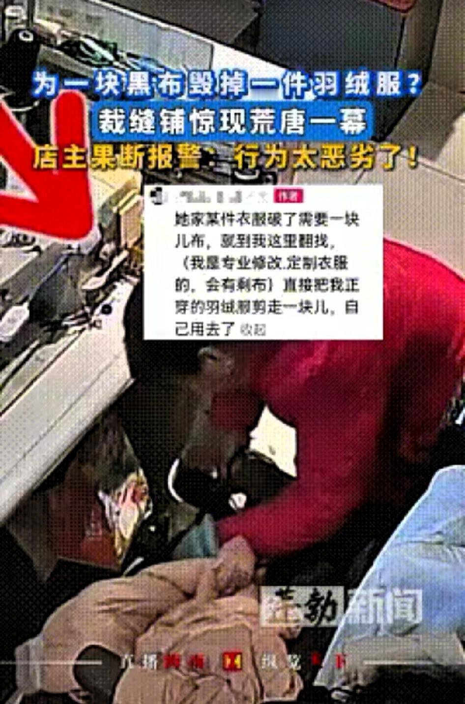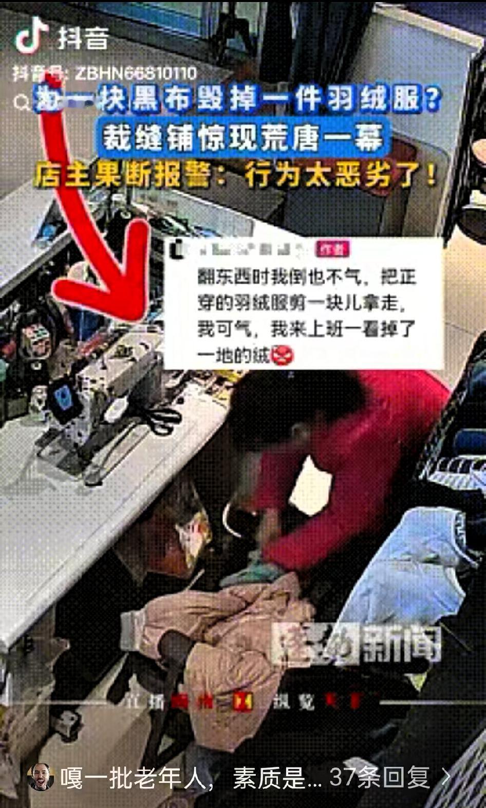 坏到骨子里了”!河南漯河,一大妈家里有衣服破了,需要一块黑布,于是大妈就跑到裁缝店找布,进店后她自顾自翻找了一通,没找到合适的黑布,这时她注意到店主放在店里的一件黑色羽绒服,面料刚好符合需求。 趁着店里没有其他人,大妈拿起剪刀,直接从羽绒服上剪下了一块布,随后揣着布料离开,完全没考虑这件羽绒服还能不能正常穿着,也没意识到自己的行为会给店主带来损失。 店主到店后,一眼就看到了地上散落的羽绒,再看那件被剪得破了洞的羽绒服,又气又纳闷。她赶紧调取店里的监控,这才发现是前来找布的大妈所为,随即选择了报警。 这根本不是一块布的小事,而是做人的底线问题。店家允许客人进店找边角料是情分,绝不是可以随意损坏他人私人物品的理由。这种行为,既辜负了别人的善意,也违背了公序良俗。 年纪大从来不是肆意妄为的借口,损坏他人财物本就该照价赔偿,这是无可争辩的道理。店主报警的做法很合理,面对这种损害自身权益的行为,就该用合法途径维护自己的利益,不能纵容这种歪风邪气。