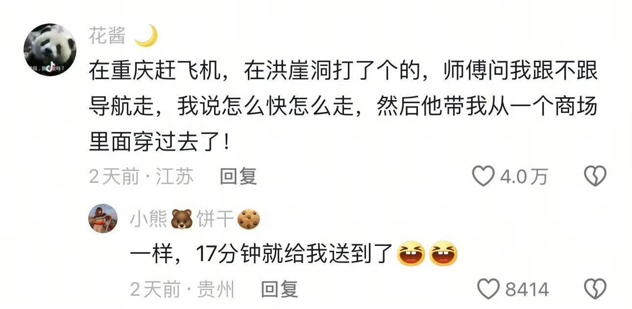 在重庆赶飞机,在洪崖洞打了个的,师傅问我跟不跟导航走,我说怎么快怎么走,然后他带我从一个商场里面穿过去了!