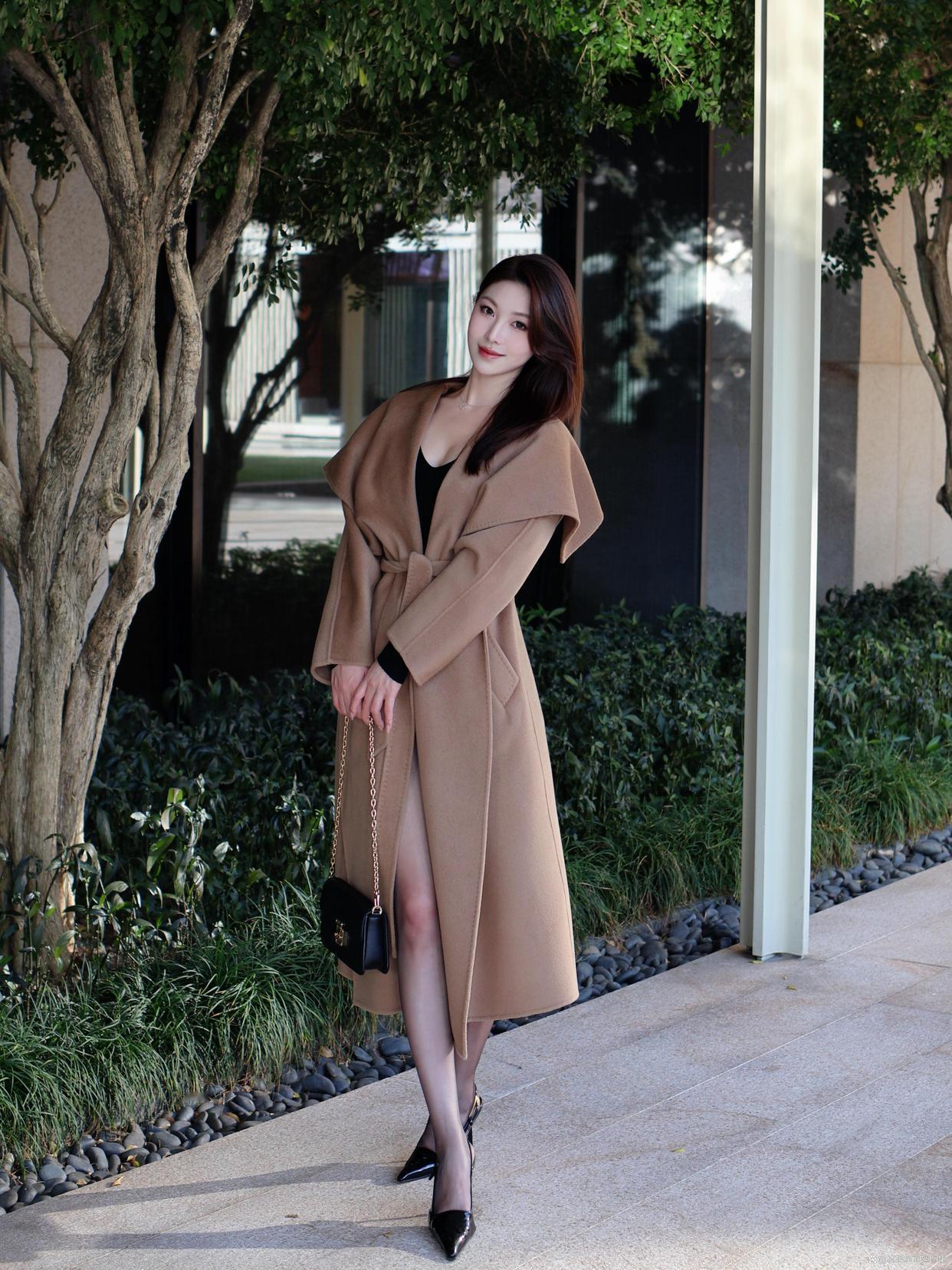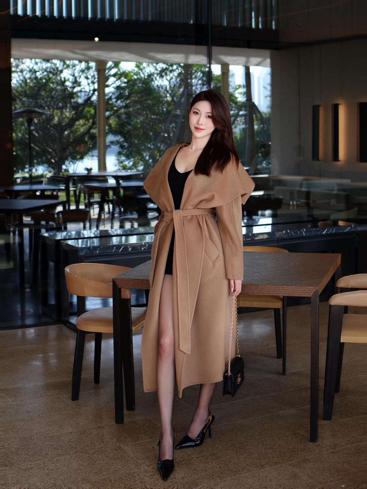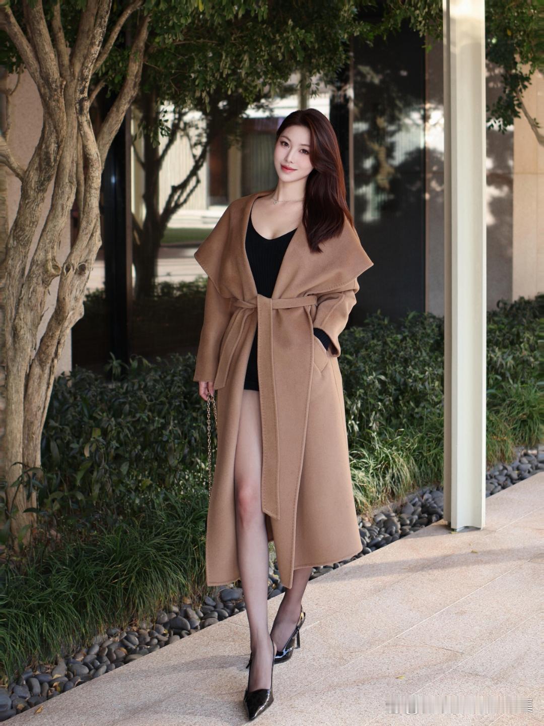 驼色大衣的高级感真的藏不住!宽松的披肩领设计自带慵懒气质,系上腰带又能勾勒出腰线,内搭黑色修身打底,再搭配黑丝与漆皮高跟鞋,温柔与性感完美融合。简约的黑色手包作为点缀,让整体造型更有层次感,不管是日常出街还是约会穿搭,这样搭都能轻松拿捏优雅氛围感~
