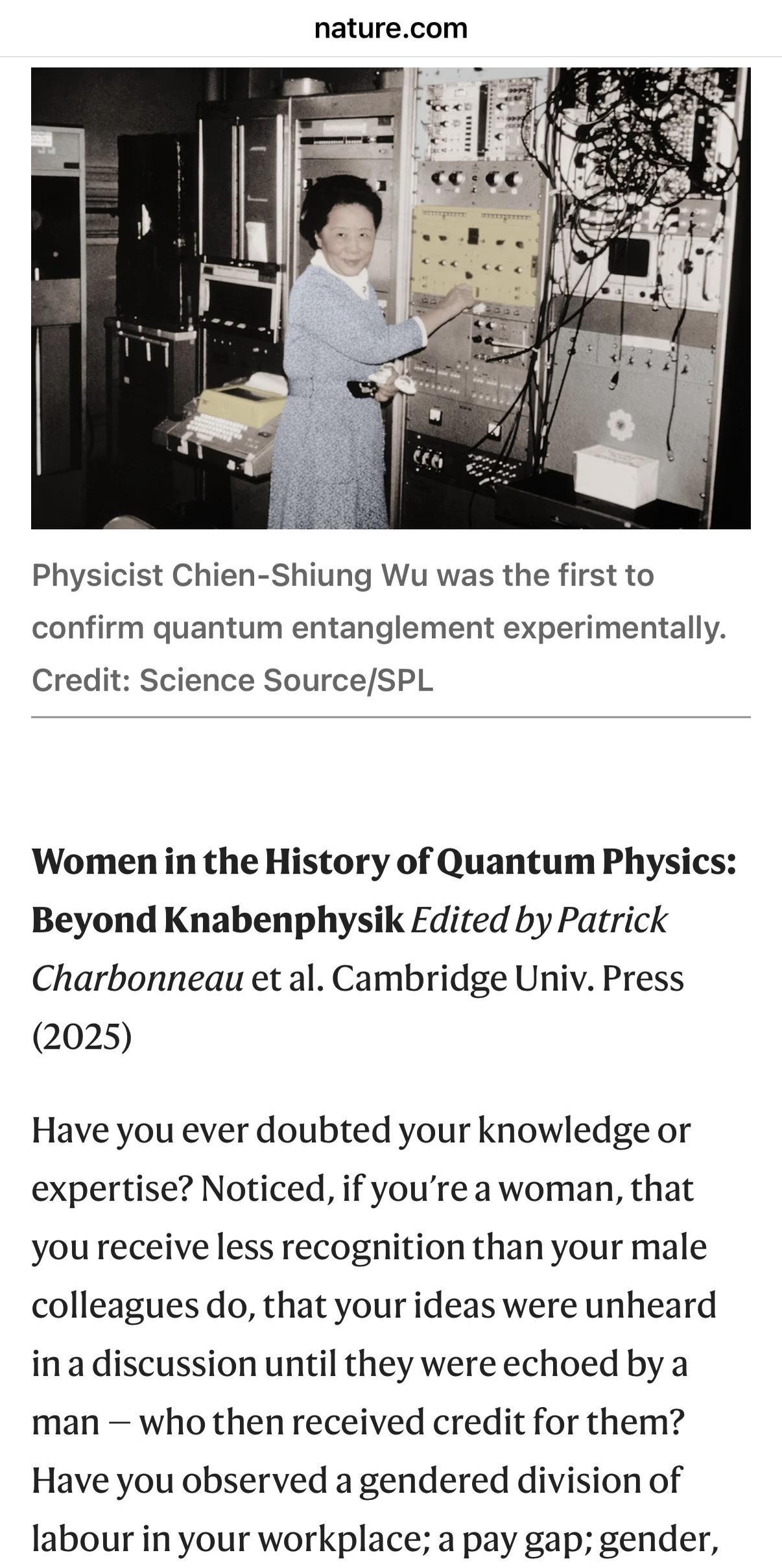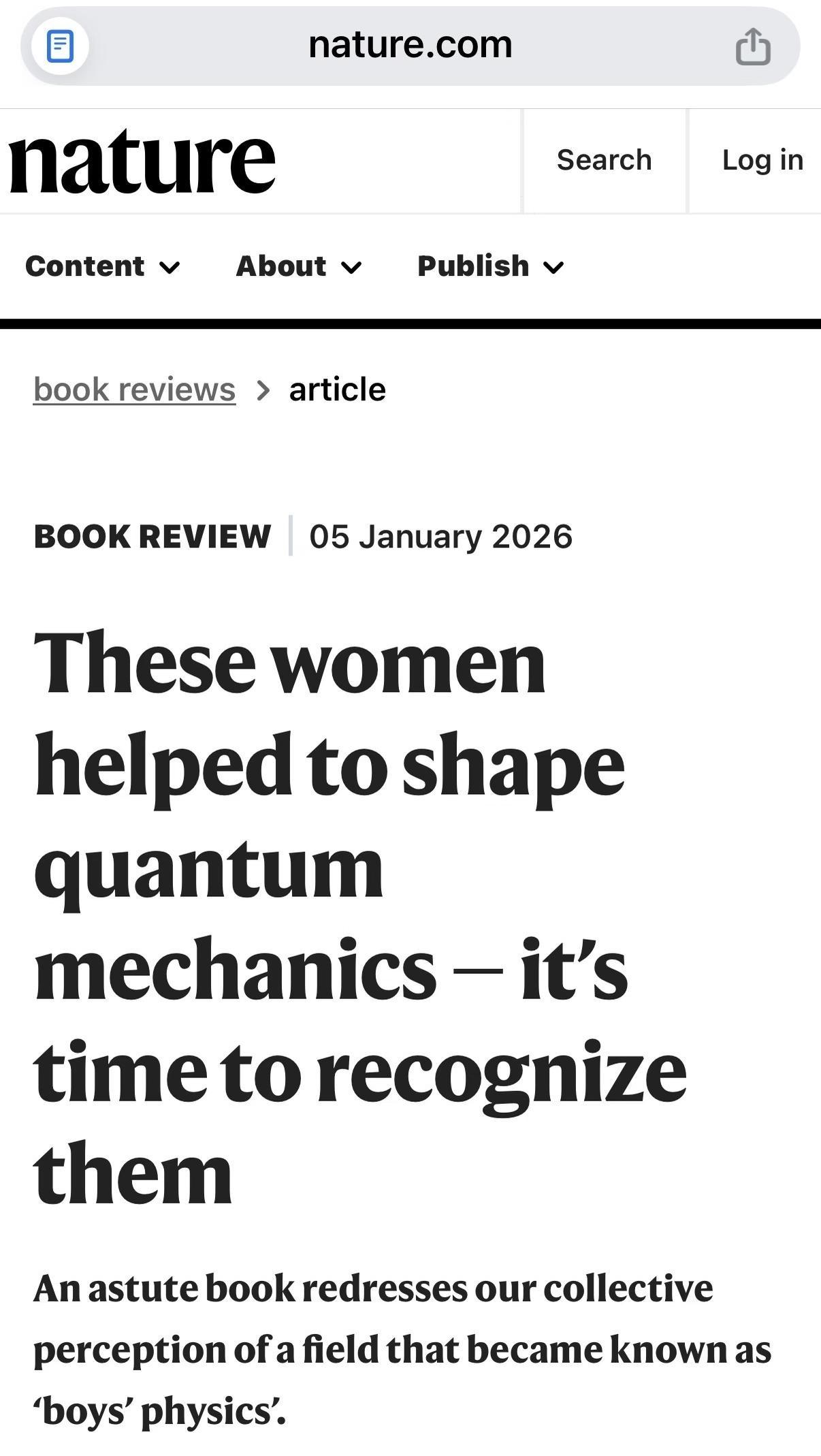 Nature 书评开篇第一个女性名字:吴健雄 2026开年最新的 Nature 书评,如图二,讨论量子力学史上被忽视的女性科学家。文章开篇第一个被提名的,是吴健雄。见图三。该文集合了足足 16 位对量子物理发展做出重要贡献的女性科学家。 理由很清楚:她完成了验证弱相互作用中宇称不守恒的关键实验,直接改变了物理学对基本对称性的认识,这是量子理论发展中的分水岭。书评强调的,是这种长期被低估却具有决定性影响的贡献。 虽然在中文世界,吴健雄以及其他华人物理学家的名字能够为人知晓。但是放眼世界舞台,恐怕即使华人最顶级的物理学家杨振宁、李政道、丁肇中等的名字也难以广为外国人所知。 放在今天再看,多少有些感慨。在海外环境对华人愈发审视甚至打压的背景下,Nature 选择把吴健雄写在第一行,本身就是对事实和专业的尊重。 科学家 女性科学家 论文 Nature 女性成长 科学史 女性力量 物理 留学生