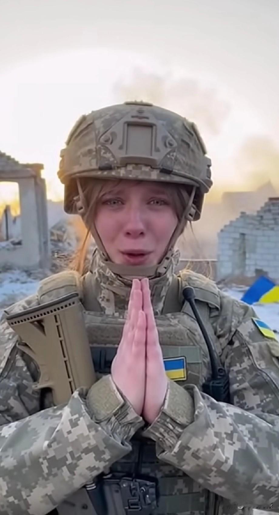 这个乌克兰女子,身上全副武装,双手合十对着镜头,眼中噙满了泪水,嘴里不停的说着话,看到她伤心欲绝的表情,听到她说出来的话语,让人的心里百感交集,不是滋味,一场可怕的战争,把如此美丽的女人也拖入战火之中,无比的唏嘘,无比的感叹!