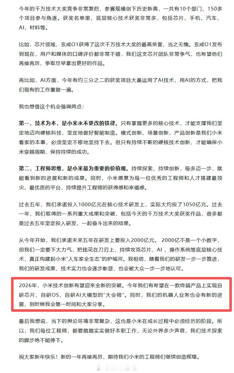 雷总:2026 年,小米有希望在一款终端产品上实现自研芯片、自研 OS、自研 AI 大模型的“大会师”。肯定是手机产品,就是不知道哪款机型,小米 17S Pro 还是 MIX 系列?