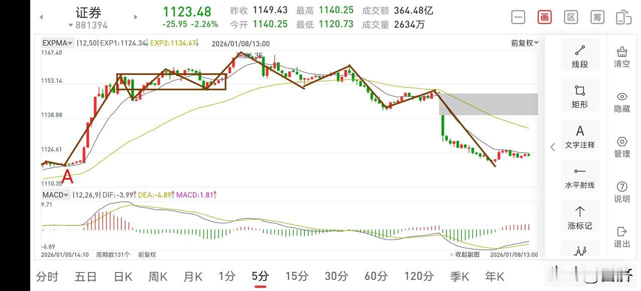 聊聊证券板块(2026.1.8) 这二天证券板块进行了一个快速调整,但调整是健康合理的,此处无需担忧,在牛市背景下,快速下跌只会带来更大的机会,目前在操作上仍可继续考虑5成仓位持股待涨。 1.从30分钟图一上看,目前30分钟一笔回踩已接近尾声,这笔回踩大概率会进入下方中枢区间,然后才会出现短线低吸高抛的买点。 2.从5分钟图二上看,昨天尾盘形成了5分钟的二卖,所以今天才会出现强势下挫,离下方30分钟中枢区间只有一步之遥,下午还会构建一个新的5分钟下跌中枢,等形成趋势背驰后便可考虑把仓位加至7成,然后后面操作以5成仓位为底仓,二成仓位进行低吸高抛操作。整体这段回踩是日线一笔回踩,所以后面还会出现更好的买点,到那时才是满仓操作的时候。证券板块动态 目前能持仓券商股票吗