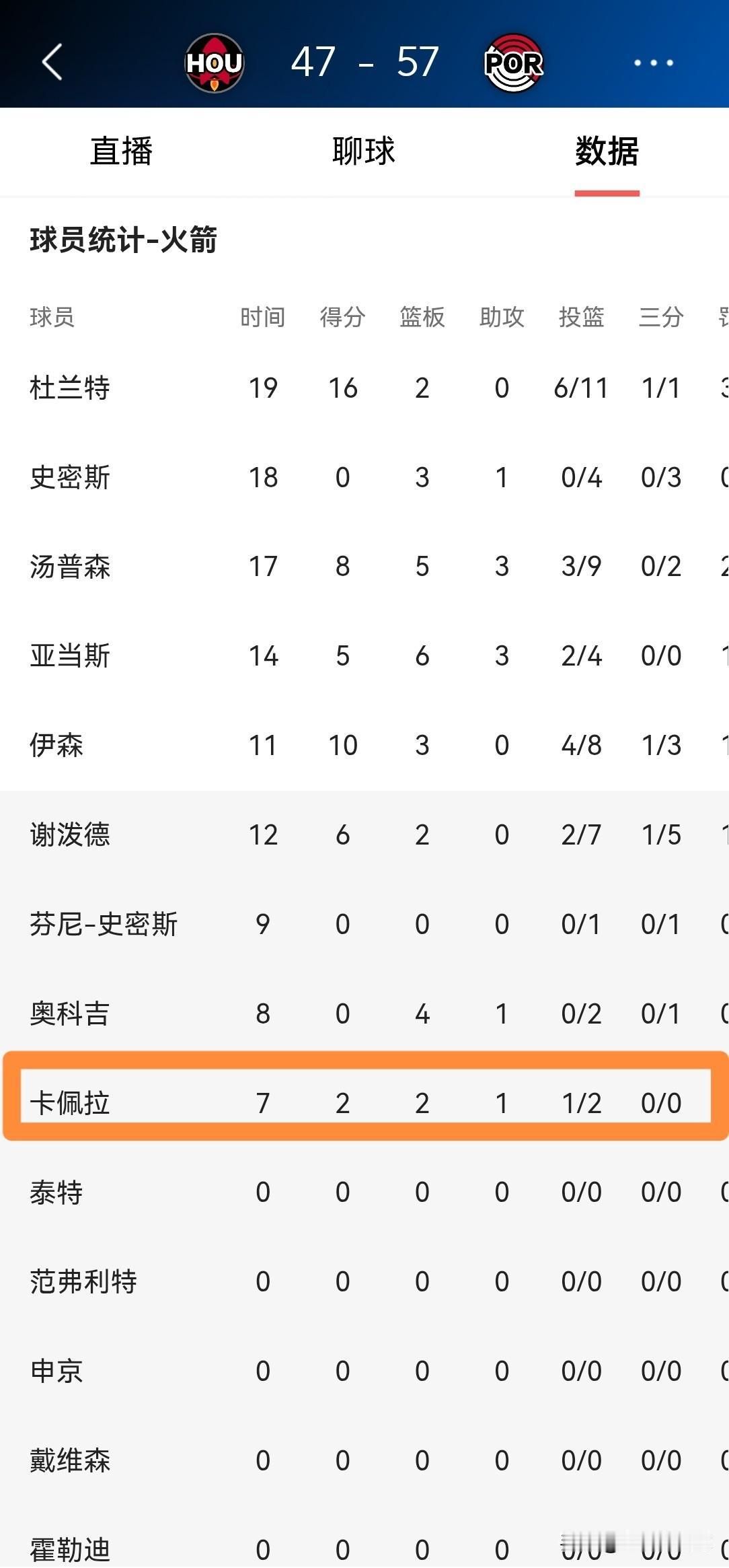 我强烈建议火箭主帅乌度卡增加卡佩拉的上场时间!在今天火箭客场挑战开拓者的上半场比赛中,卡佩拉仅仅得到了7分钟的上场时间,投篮2中1得到2分2篮板1助攻1盖帽,他的场上正负值为-3。 坦白说,在前两节比赛中卡佩拉的场上效果非常不错,只可惜他的上场时间真的太少了。如果火箭想要赢下本场比赛,那么乌度卡教练必须在下半场比赛中增加卡佩拉的上场时间才行。