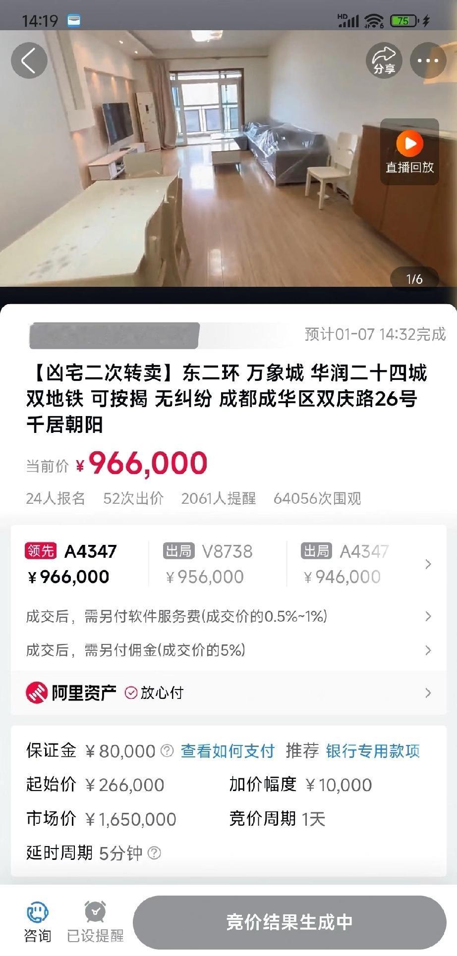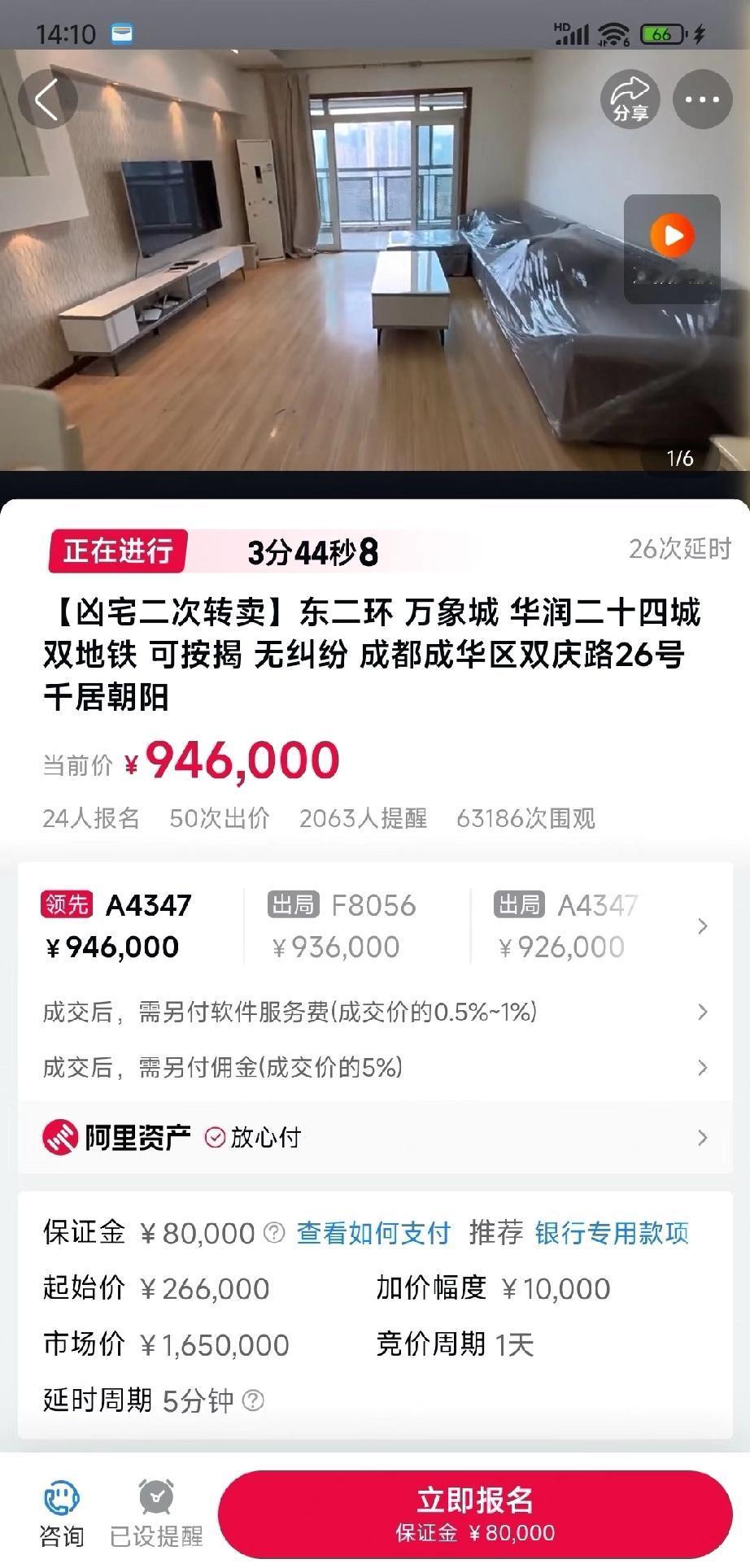 梅开二度的成都凶宅。 之前火热的凶宅又以26.6万的价格重新上架了,这次成交价格96.6万,比第一次的105万成交价又优惠了10万左右,最后20分钟的密集竞价彰显商拍的魅力了。后2图是该小区贝壳的成交均价参考,15000成交均价,90平面积,市场价130万左右,凶宅打折90万成交也算合理价位了,不知道还会不会再来一次帽子戏法了。