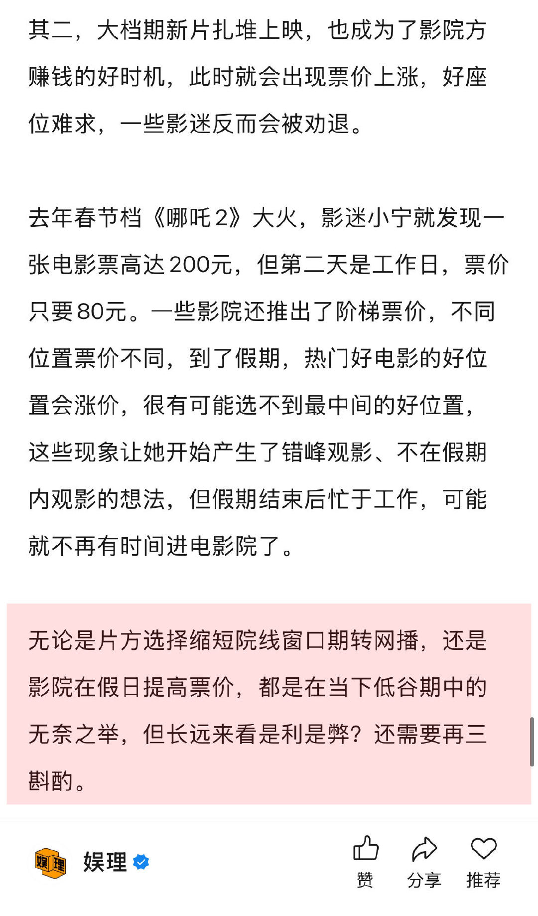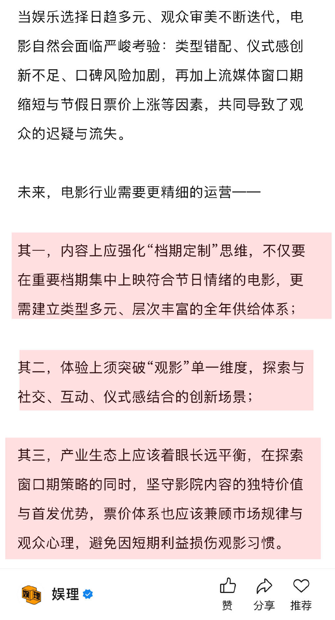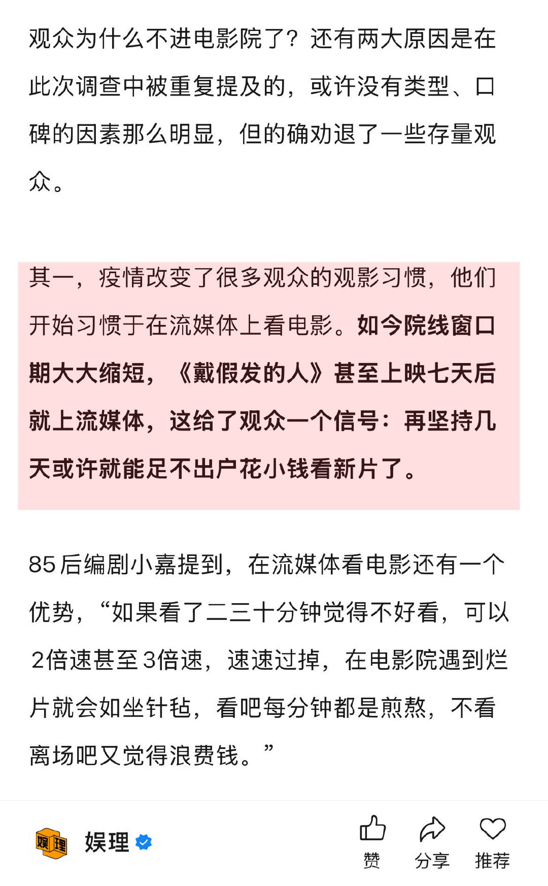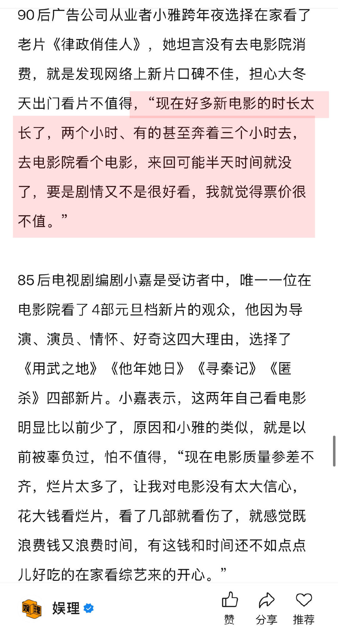 观众为什么不进电影院了 大IP对非影迷类受众更有吸引力 观众并不是在几部电影中做选择题,市场也不是全靠同行衬托,这是一个一损俱损的时代,当一部电影口碑烂的消息传出后,观众就可能被从整个元旦档劝退。00后公司职员小千今年被朋友邀请,一起去看了《情圣3》,她告诉,看完之后就对元旦档其他电影也失去了信心。娱理独家↓