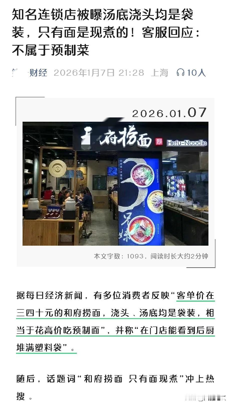 西贝扛不住的锅,和府来扛 打着“现煮现熬”旗号,卖中央厨房预制出品 后厨小哥大方明确 “我们的食材全部来自企业的中央厨房配送,不算预制。” 一碗面30-40块,下单到出餐,全程2分钟,讲究的是赚钱的高效率。 预制菜的风波真是一波未平一波又起,西贝的预制风波还没散尽,和府再来一波。 其实“预制”不是原罪,消费者要求的不多,要的只不过是别拿“预制”卖新鲜现炒的价格,和明码标价、明确告知“预制”的知情权。 可偏偏,一些商家就是要用“预制界定”的概念标准来说事。 消费者可不管你这些“预制标准”,他们只懂得“新鲜现炒”与否。 ✨建议商家多点调查了解消费者的消费需求和心声,顾客是上帝,获得消费者的信赖和支持,才是企业持续稳定发展的根本! 来源|红星新闻、第一财经