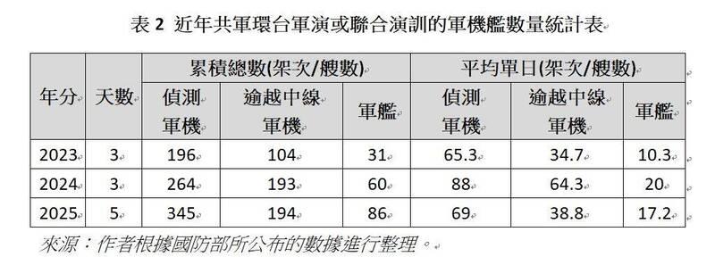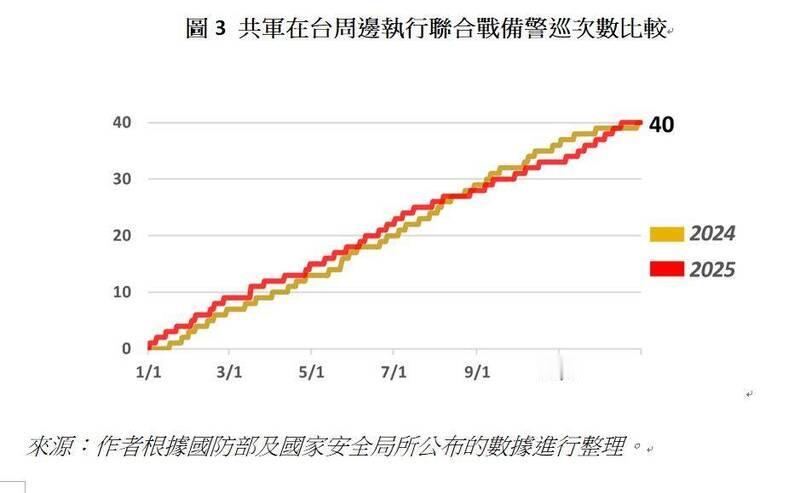 台湾人总结研究解放军围台后 得出了以下五个结论 第一,2025年度军机舰围台的数量成长幅度放缓。2024年是前一年的1.8倍,2025年则是前一年的1.23倍。 第二,2025年的单月军机舰围台的数量未超过2024年的极值。2025年单月最高是7月的547架次,2024年7月607架次,2023年4月564架次。 第三,2025年的联合战备警巡次数和规模,并没有明显超越2024年。2024及2025年解放军在台周边进行联合战备警巡均为40次。 第四,执行联合战备警巡当日的解放军军机舰数量,2025年也没有较2024年明显还多。2024年共1337架次、2025年共1328架次 第五,2025年的环台军演平均单日规模没有比2024年更为增加。2025年5日的平均单日侦测军机69架次、逾越中线军机38.8架次、军舰17.2艘,明显不如2024年的平均单日侦测军机88架次、逾越中线军机64.3架次和军舰20艘。