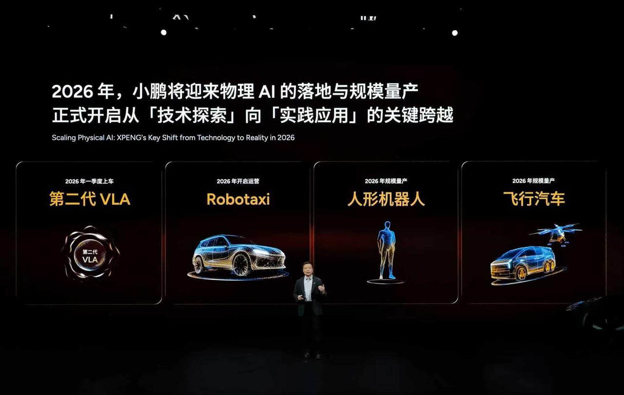 小鹏面向全球用户发布了鲲鹏超级增程,正式开启「一车双能」的时代。2026年,小鹏将围绕两大关键词大步向前:物理AI、全球化。 同时,2026年小鹏将迎来物理AI的落地和规模量产: ✨Q1「第二代VLA」量产上车 ✨开启运营Robotaxi ✨实现人形机器人和飞行汽车的规模量产 小鹏正式开启从「技术探索」向「实践应用」的关键跨越。 小鹏新年四车齐发