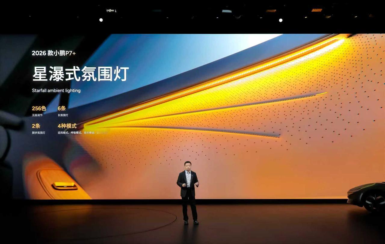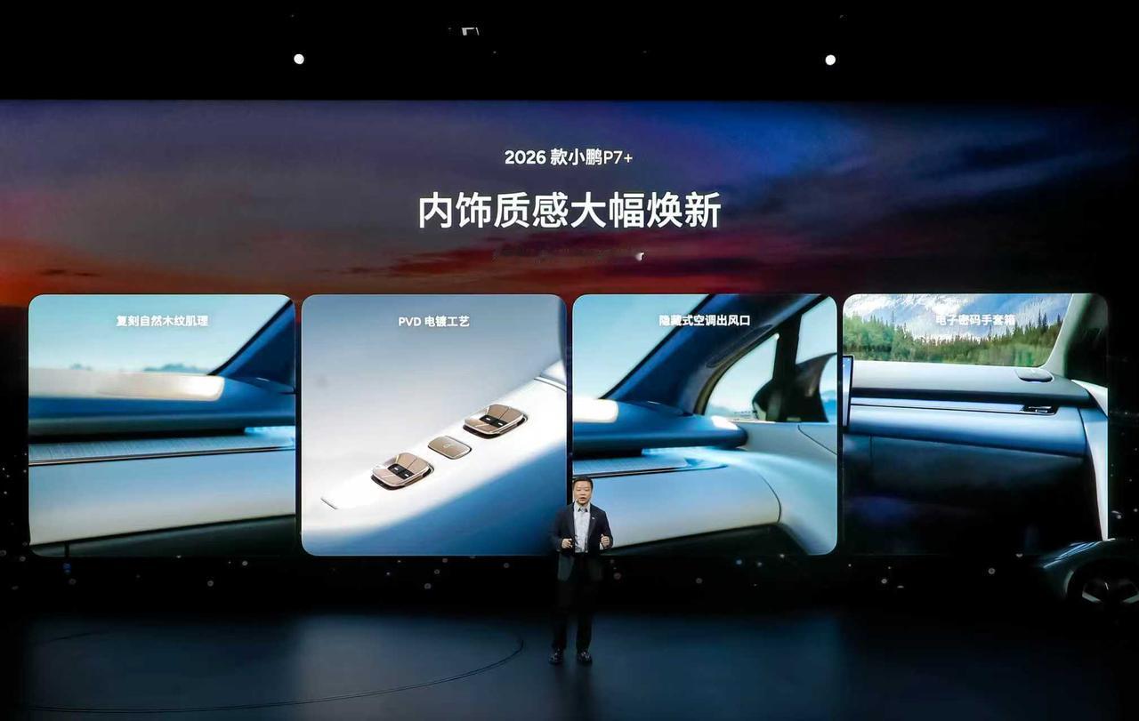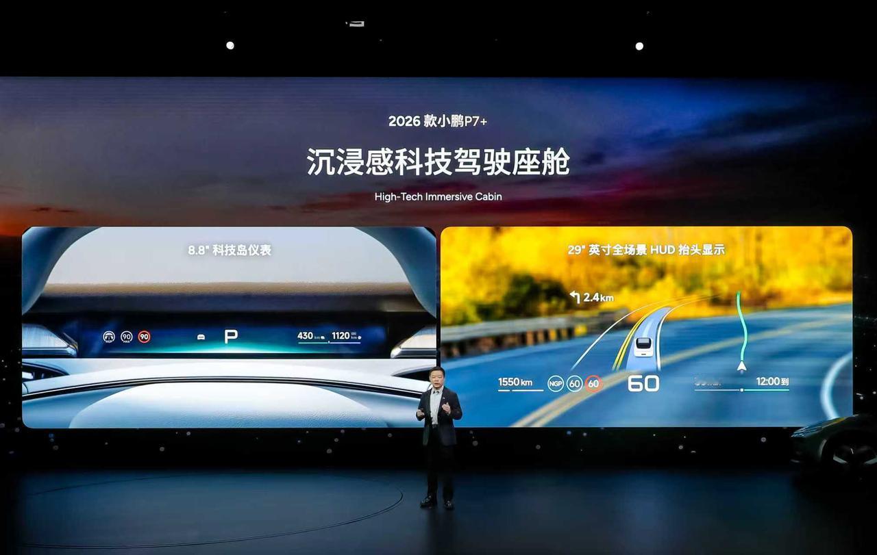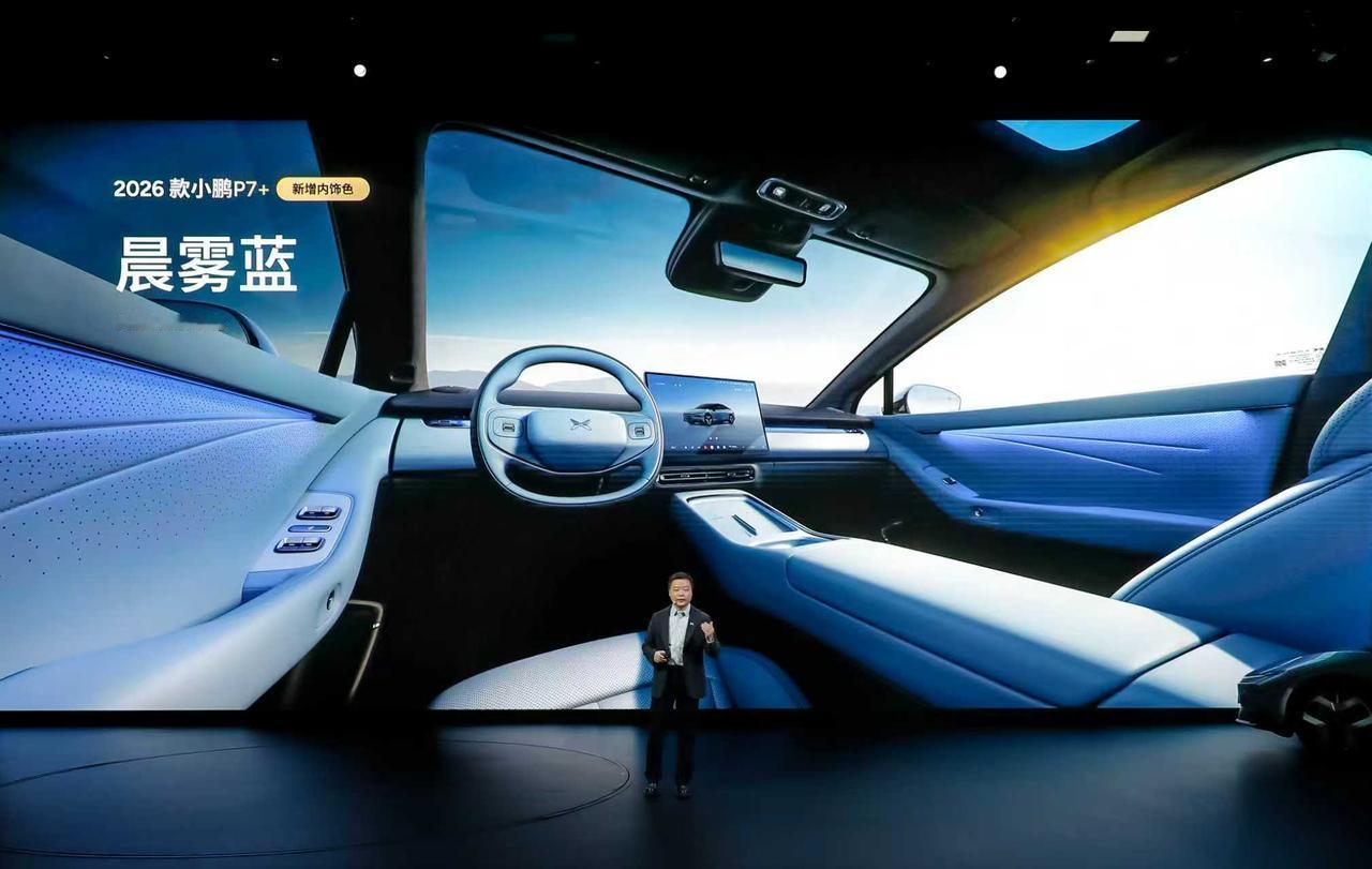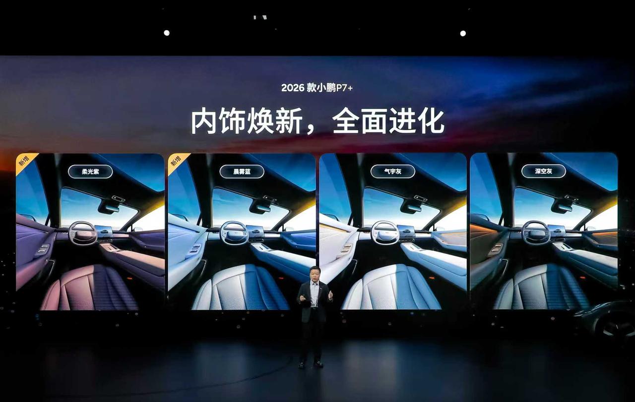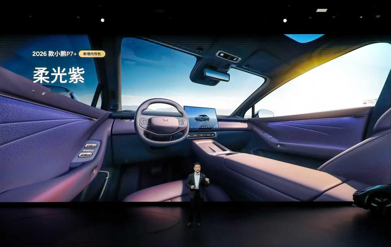 2026款小鹏P7+还是舒适的空间怪兽,88%同级最大得房率,拥有媲美行政级轿车的乘坐体验。 新P7+内饰全面焕新,新增柔光紫、晨雾蓝2种配色,视觉观感更舒适; 同时内饰质感也大幅焕新,车门按键和氛围灯装饰采用腕表级的 PVD 电镀工艺,更有高级感、更耐磨;新增电子密码手套箱,贵重物品都可以放在里面;采用星瀑式氛围灯,256色无极变色、4种模式氛围感拉满。 搭载8.8寸仪表盘 + 29英寸全场景 HUD,导航信息抬头可见,无需低头,大幅提升驾驶便利性与安全性。 小鹏新年四车齐发 新款小鹏P7+自带空间魔法
