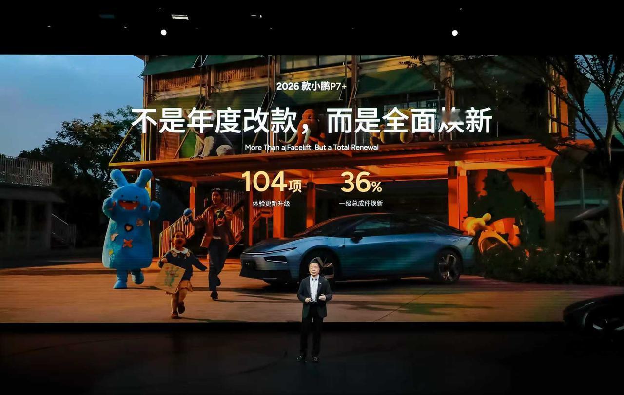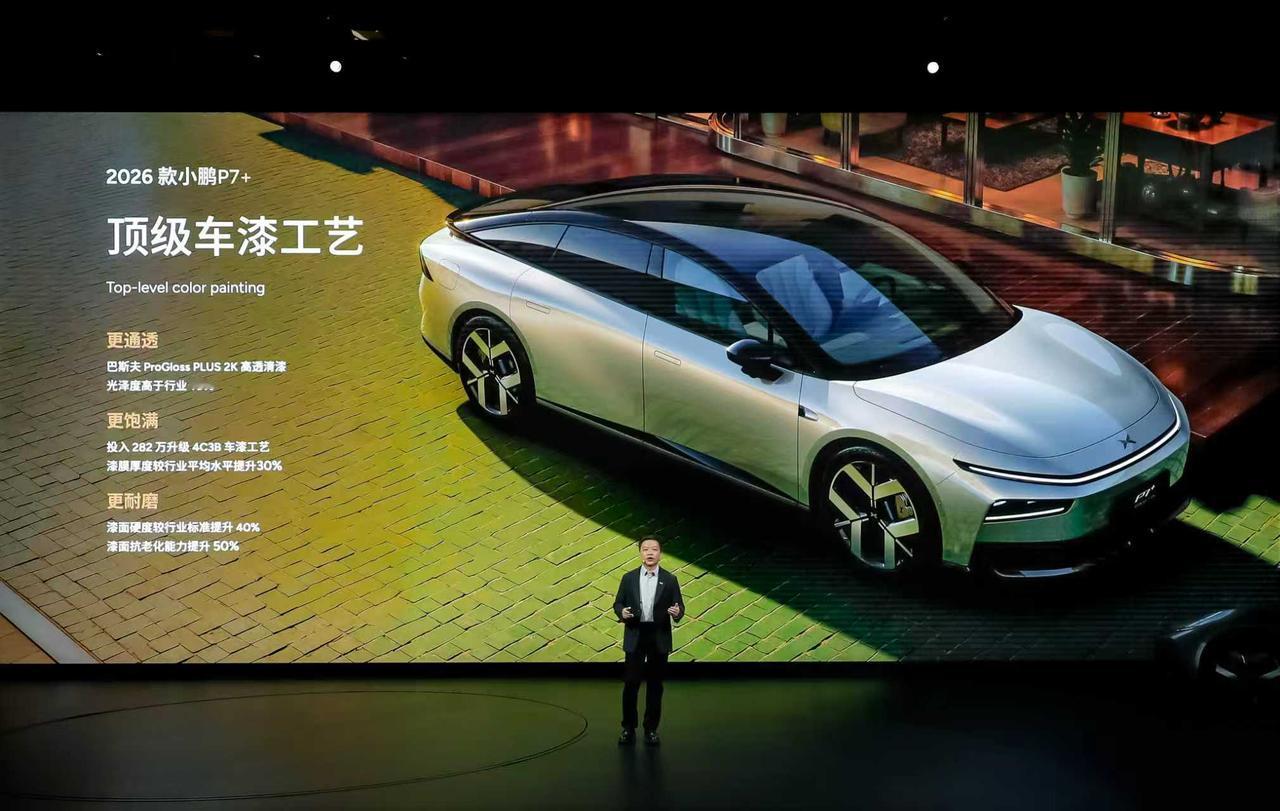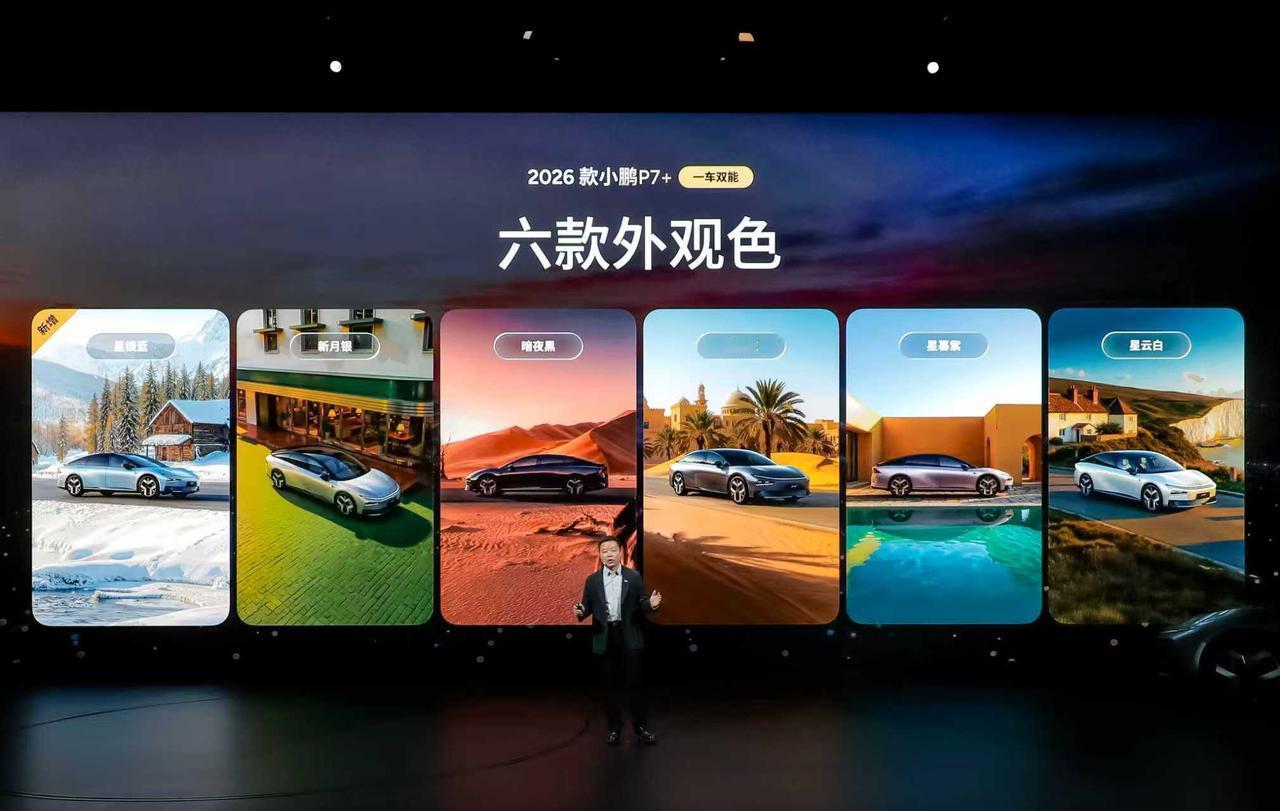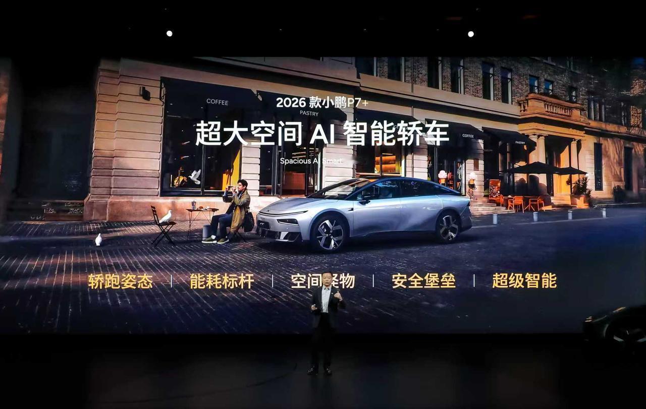 小鹏发布「超大空间AI智能轿车」2026款小鹏P7+,以全球标准打造,并将在36国发布。 2026款小鹏P7+全面焕新,带来104项体验更新升级,一级总成件焕新36%,拥有轿跑姿态、标杆级能耗、空间怪兽、安全堡垒、超级智能等特性。 新款小鹏P7+推出六款外观色,其中新增全新「星镜蓝」。采用巴斯夫高透清漆,光泽度高于行业10%;同时投入路特斯同款4C3B车漆工艺,漆膜厚度较行业平均水平提升30%;漆面硬度较行业标准提升40%、漆面抗老化能力提升 50%,更耐磨。 全新一体式星翼贯穿灯带1730毫米,可根据不同场景切换;全新一体式星轨贯穿尾灯更是融入智驾小蓝灯,整个车尾造型更加富有科技感。 轮毂上,新的P7+提供 19 寸和 20 寸两款轮毂可选,满足用户在经济和颜值上的不同需求。 小鹏新年四车齐发新款小鹏P7+自带空间魔法