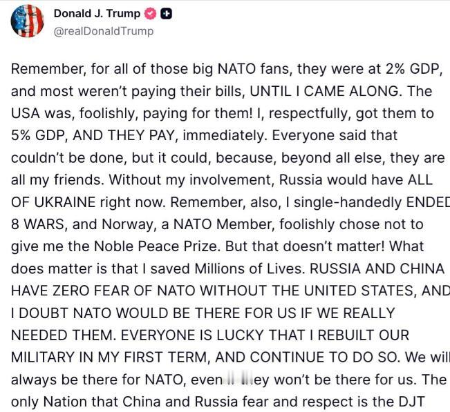 特朗普:中俄两国唯一畏惧且真正尊重的国家,就是经我一手重振的美国。 特朗普就自身在牵制俄罗斯及“重振”北约联盟中所发挥的作用发表重磅言论称,正是凭借自己推动盟国增加防务开支、强化美军战力的一系列举措,才遏制了俄方的进一步行动。“若没有我,俄罗斯此刻早已经掌控整个乌克兰。” 特朗普这番言论,典型延续了他一贯自吹自擂的风格,核心就是把自己塑造成美国霸权的“救世主”,尤其在牵制俄罗斯、整合北约这件事上,把所有功劳都往自己身上揽。 他说“若没有我,俄罗斯此刻早已经掌控整个乌克兰”,这话听着霸气侧漏,本质上就是给自己的对俄对欧策略贴金,背后藏着一套“威逼盟友、强化威慑”的小心思。 特朗普心里门儿清,北约这些年早就是一盘散沙,欧洲不少国家靠着美国的军事保护伞,在防务开支上一直偷奸耍滑,之前北约约定的国防支出占GDP 2%的目标,多数成员国都没达标,这让美国觉得自己在做“亏本买卖”,费力不讨好。 所以他上台后就换了副面孔,不再像前任那样无条件兜底,而是拿着“踢出北约”的大棒到处威胁,逼着盟友把国防开支提上去,甚至还狮子大开口,要求盟友把支出占比拔高到5%,远超之前的2%标准。 就像德国,之前国防开支常年徘徊在GDP的1.2%左右,被特朗普公开点名批评,还威胁要撤回驻德美军,最后德国不得不松口,承诺逐步提高开支; 还有西班牙,因为只愿意把开支维持在2.1%、拒绝大幅加码,也被特朗普拿捏,扬言要在贸易谈判中让其付出代价。 这种强硬施压确实让不少北约成员国表面服软,在峰会上签下了2035年前逐步达标5%的承诺。 特朗普也顺势把这当成了自己“重振”北约的核心功绩,觉得靠这套操作强化了北约的整体战力,才让俄罗斯不敢轻举妄动,甚至把牵制俄罗斯的功劳全算在自己头上。 他口中的“经我一手重振的美国”,说白了就是觉得自己通过逼盟友买单、给美军扩军加钱,让美国的霸权地位更稳固了,所以才敢大言不惭地说中俄都会畏惧这样的美国。 但稍微琢磨一下就知道,这一套全是自我美化的话术,所谓的“重振”不过是靠高压逼出来的表面团结,根本没真正提升联盟的凝聚力。 就像荷兰银行的经济学家早就直言,5%的军费目标对大多数欧洲国家来说根本不切实际,很多国家连之前2%的标准都难达标,就算签了承诺也大概率是空头支票。 更讽刺的是,美国自己2024年的军费支出占比也就3.4%,却逼着其他盟国达到5%,说白了就是想让欧洲多花钱买美国的武器,既让美国军工企业赚得盆满钵满,又能以更少的投入维持对欧洲的掌控。 他把俄罗斯没“掌控乌克兰”的功劳全算在自己头上,更是忽略了俄乌冲突的复杂性,俄罗斯的战略决策受地缘政治、自身实力、国际舆论等多重因素影响,绝非靠美国几句威胁、逼盟友加几笔军费就能左右的。 而他说中俄畏惧这样的美国,纯属一厢情愿的自我陶醉,中俄两国的外交和战略决策从来都是基于自身核心利益,靠的是实力对等和相互尊重,绝非对某个国家的畏惧。 特朗普之所以这么说,一方面是为了彰显自己的执政功绩,尤其是在他大概率要再次竞选总统的背景下,这样的言论能讨好国内的鹰派势力和军工集团,拉取选票; 另一方面也是想通过渲染“中俄威胁”,进一步绑定北约盟友,让他们更依赖美国的军事保护,从而巩固美国在西方阵营的主导地位。 这种把国际博弈当成个人秀场、把盟友当提款机的操作,说到底还是为了自己的政治利益,至于所谓的“重振美国”“遏制俄罗斯”,不过是用来包装个人野心的幌子罢了。