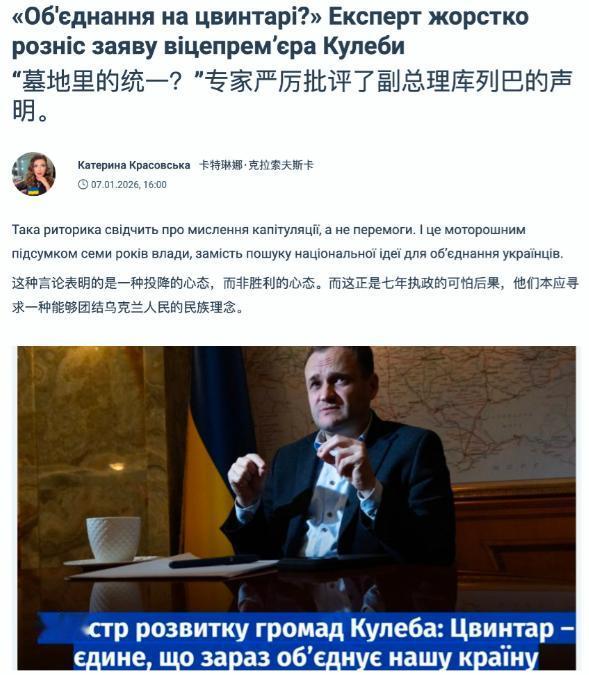 “公墓是现在唯一能将我们国家团结起来的东西。”乌克兰副总理兼社区发展部长奥列克西·库列巴在一次采访中这样说。 这话听着扎心,却是对当下乌克兰现状最直白的戳破,这话从负责地区政策的他嘴里说出来,比任何官方宣传都更能反映真实的国情。 他特意点出基辅距离战区550公里,暗示基辅与现实脱节,靠编造好消息麻痹社会。 这本身就说明乌克兰内部早已不是铁板一块,所谓的团结早就成了经不起推敲的空壳,只剩下战争带来的死亡与伤痛,还能让不同地区、不同立场的人产生一点共通的情绪,说穿了就是悲剧之下的无奈共鸣。 库列巴的表态其实撕开了乌克兰官方宣传的遮羞布,那些动辄宣称“军民一心、上下团结”的话术,在“公墓维系团结”的现实面前显得格外讽刺。 要知道,基辅作为首都,远离战火纷飞的前线,当权者或许还能靠着粉饰太平维持表面的稳定,但前线的士兵、失去亲人的家庭、饱受战乱之苦的普通民众,早已被战争拖得精疲力尽。 之前美乌领导人争吵后,乌克兰社交媒体上就充斥着民众对美国的不满,有人支持泽连斯基对美说“不”,也有人抱怨美国没有同情心、不会提供真正的安全保障,就连高官们集体表态“军队与人民、最高统帅团结在一起”,更像是一种强行挽尊的自我安慰。 这种表面的一致背后,是民众对战争前景的迷茫、对外部援助的依赖与失望,而公墓里不断增加的墓碑,成了所有分歧之外唯一的共识,毕竟无论支持还是质疑这场战争,失去亲人的痛苦都是共通的。 更关键的是,库列巴提到的“平衡”,本质上是乌克兰当下无法解决的核心矛盾:基辅的政治算计与前线的残酷现实之间的脱节。 当权者想靠着虚假的好消息稳住社会,却忽视了民众正在承受的实实在在的苦难,当生活只剩下生存与哀悼,所谓的国家愿景、政治理想都变得毫无意义,只有公墓里的同胞能让大家感受到彼此同处一场灾难之中。 这也侧面反映出乌克兰社会凝聚力的彻底崩塌,曾经或许还有共同的发展目标、民族认同作为团结的纽带,而持续的战争早已把这些都消磨殆尽。 外部援助的不确定性、内部治理的混乱、前线的节节败退,让乌克兰人找不到前进的方向,只能在共同的悲剧里寻求一丝共鸣。 库列巴的这番话,与其说是对现状的总结,不如说是一种无力的吐槽。 毕竟当一个国家只能靠死亡来维系团结时,早已说明其内部的分裂与绝望已经深到了骨子里,所谓的“庞大军事力量”和“繁重工作量”,在这种深层次的分裂面前,也只是徒劳的挣扎而已。