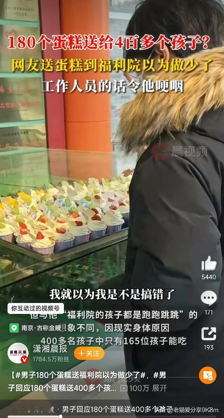 今天刷到一个视频,真的破防了!南京一位95后小伙杨先生,元旦给福利院送了180个小蛋糕,原本以为数量刚好,结果工作人员一句话让他愣住了——福利院其实有400多个孩子,但只有165个能吃到蛋糕! 原来,剩下的孩子因为身体原因,根本没法吃小蛋糕。杨先生当时就懵了:“我以为只是条件没那么好,没想到现实比电视剧残酷多了。”更让人心疼的是,这165个孩子里,还有很多是卧床的,需要工作人员一个个喂饭… 视频里,杨先生哽咽着说:“发这个不是想秀自己做了什么,而是想让大家知道——我们想象中的善意,和真实情况可能差得很远。” 工作人员还提到,现在生育率低,符合条件的孩子很快会被领养,留下的基本都是身体有特殊需求的… 看着视频里工作人员统一领取蛋糕的画面,杨先生才明白:不是管理严格,而是很多孩子根本来不了。 最后问老师需要什么时,对方回答“大号尿不湿”,那一刻,杨先生和屏幕前的我们都沉默了… 评论区很多网友也感慨:“原来福利院的孩子不是我们想的那样!”“第一次知道这些细节…”确实,我们总以为捐衣服、捐食物就够了,却忽略了那些卧床、需要特殊护理的孩子,他们的需求更隐蔽,也更需要关注。 杨先生的举动或许不大,但这份真实的触动值得被看见!他说:“哪怕只是转发,让更多人知道,微弱的星光也能照亮角落。” 下次去福利院捐赠时,不妨多问一句:“孩子们现在最需要的是什么?”也许不是玩具,而是尿不湿、护理用品;也许不是蛋糕,而是能咀嚼的软食。善意不分大小,精准才能更温暖! (文章素材来自潇湘晨报,侵删)