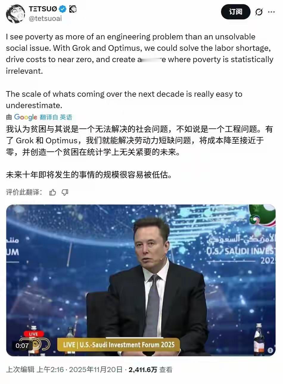 马斯克惊天预言引爆全球焦虑:2026年机器人将抢走你的饭碗,但塞给你一堆钱!人类未来是躺赢还是躺平? (来源:综合自马斯克公开演讲、特斯拉技术发布会、财经媒体分析及行业研报) 当马斯克站在2025年美国沙特投资论坛的聚光灯下,他抛出的每一句话都像一颗深水炸弹:“人工智能和机器人会消灭贫困,让每个人变得富有。”台下掌声雷动,但屏幕前的普通人却脊背发凉——如果贫困真的被技术“消灭”,我们究竟会成为坐在黄金堆上的赢家,还是被时代列车抛下的孤儿? 这并非科幻小说的桥段。马斯克随后在X上补充道,人类将获得“超乎寻常的医疗保险”和“比游戏更有趣的体验”。然而,甜蜜承诺的背后藏着一把冰冷的钥匙:这一切的前提是“人工智能必须重视真理和美”。换句话说,若失控的技术沦为资本的工具,所谓的“富有”或许只是少数人的狂欢。 更残酷的是,马斯克轻描淡写地划分了贫困的界限——他指的是“绝对贫困”,而非心理上的相对剥夺感。言下之意,贫富差距可能永远存在,甚至因技术鸿沟愈演愈烈。当机器人替你劳动、AI替你思考,你的价值究竟该锚定在哪里?是账户里凭空多出的数字,还是被时代淘汰的窒息感? 具身智能的赛道上早已硝烟弥漫。Wind数据显示,2025年具身智能指数涨幅超60%,机器人指数暴涨35%。资本像嗅到血腥的鲨鱼般涌入,宇树、智元等企业争相冲刺IPO,仿佛晚一步就会坠入深渊。宇树将人形机器人价格压到3.99万元,相当于一线城市白领一个月的薪水;智元则借壳上市,股价狂翻15倍,造富神话刺激着所有人的神经。 但泡沫之下,暗流涌动。马斯克预言2026年将成为技术爆炸的奇点:特斯拉人形机器人量产成本降至2万美元,自动驾驶安全性超越人类10倍,AI芯片算力碾压英伟达……这些数字编织出一幅诱人图景:未来,机器人医生遍布医院,流水线5秒造一辆车,甚至手机和APP都将消失。 然而,美好愿景的另一面是残酷替代。麦肯锡报告指出,全球8亿岗位将在2030年前被重构;OpenAI研究显示,80%的工作可能被AI取代。当机器人以每月几千块的成本日夜不休,那些曾以为“技术无法复制人情”的教师、医生、设计师,突然发现自己的经验正被数据洪流淹没。 普通人该如何自救?马斯克的答案隐晦而冰冷:要么学会驾驭AI,要么被AI驾驭。但更深的恐惧在于——如果连创造、情感、决策都被机器蚕食,人类是否只剩“被圈养的价值”?技术红利或许能让账户余额膨胀,但精神世界的贫困或许才是未来最棘手的瘟疫。 或许,马斯克真正想说的并非“人类会富有”,而是“人类必须重新定义富有”。当物质稀缺被彻底消灭,生命的意义将从谋生转向寻梦。但若连梦想都能被AI量身定制,我们是否只是活在楚门的世界里? 这场变革已按下快进键。2026年不是遥远的未来,而是下一秒的倒计时。你会选择拥抱浪潮,还是困守孤岛?答案或许决定了你将成为新世界的开拓者,还是旧时代的墓碑。 人工智能革命 人形机器人