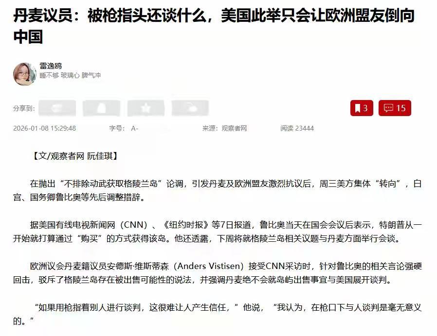 美国开始受到抓捕马杜罗的反噬被觊觎的盟友纷纷倒向中国求助 据观察者网1月8日消息,丹麦议员近期发声美国用枪指头的办法,只会让他们倒向中国来寻求帮助。中断了8年的高层互访的中加两国,在本月将迎来卡尼总理的访华之旅。 任何国家再小实力再弱,在危及存亡之际也会有所选择的。目前被美国觊觎的格陵兰岛,加拿大,巴拿马都会在此次美军的完美抓捕行动后,给自己留一条退路的。而可供他们选择的能有什么呢?自然是哪个说出了真心话的丹麦议员,倒向中国给自己多一个选择。