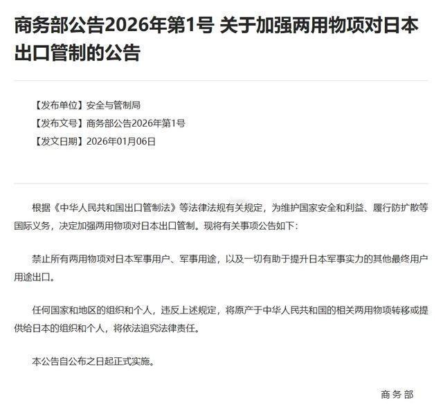 这个操作就是猛!不仅可以对日本去军事化,时间一长都可以是对日本去工业化了!要知道日本81%的原料需要进口,而两用物项禁令100多页、将近1000多项,从稀土到芯片、半导体,占进口额超过60%,可能有人还不清楚啥是两用物项,说白了就是既有民用价值,又能拿去搞军事,或者帮着提升军事实力的货物、技术和服务。 2026年1月6日,中国商务部发布2026年第1号公告,直接禁止所有两用物项向日本军事用户、军事用途出口,还包括一切有助于提升日本军事实力的其他最终用户用途。公告还明确,全球任何组织或个人要是把中国原产的两用物项转手给日本相关方,都得承担法律责任。这一下就把第三方转运的路子也堵死了。 两用物项这东西,说白了就是军民两用,根据官方定义,既有民事用途,又有军事用途,或者有助于提升军事潜力,特别是能用于大规模杀伤性武器及其运载工具的货物、技术和服务。2026年度的两用物项管理目录里有上千项,涵盖稀土、镓、锗、碳纤维、高纯度化学品、精密设备等。日本很多高端制造离不开这些,日本资源贫乏,进口依赖高,汽车、电子、半导体这些支柱产业对中国关键材料的依赖度不低,尤其是重稀土,几乎全靠外部供应。 日本那边反应挺大,内阁官房长官直接抗议,说这措施不符合国际惯例,要求撤回。但中方发言人明确表态,这是因为日本领导人近期在台湾地区问题上发表错误言论,暗示武力介入台海可能性,严重违背一个中国原则,性质恶劣。中方这是维护国家安全和利益,顺便履行国际防扩散义务。 这招管用在哪?不是全面禁运,日本民用该买还能买,但只要涉及军事,或者间接帮着提升军力,就过不去。这就把日本军备扩张的链条卡住了。日本防卫省那些雷达、导弹、舰艇项目,离不开高性能材料,很多核心部件生产得靠这些物项。库存用完后,生产线就得面临调整,短期内替代难找。 更长远看,日本工业基础也会受影响。产业链是连着的,民用和军用分不开。日本汽车企业电动车电机、半导体芯片制造,都用得上这些材料。供应一紧,成本上升,产量受限,竞争力就弱了。日本经济产业省数据也显示,关键领域对中国材料的依赖比例高,短期建新供应链成本巨大,需要时间和资金。 日本企业以前常用第三国转口的方式绕道,现在这条路也被封了。跨国公司谁也不想为这点生意得罪大市场,走私量又填不满军工需求。这措施一出,日本军事发展步伐肯定慢下来,去军事化不是空话,工业链条长期断层,去工业化风险也实打实存在。 高市早苗上台后,推动防卫政策调整,在台湾地区问题上强硬表态,不撤回错误言论,直接导致中日关系紧张。这次管制就是针对性反制,提醒日本别在核心利益上挑衅。东亚和平稳定需要大家守规矩,日本再这么折腾,吃亏的还是自己产业和经济。 总之,这操作精准有力,不动刀枪就掐住要害。日本想靠制造业和军工翻身,没那么容易。原料卡脖子,时间一长,啥扩张计划都得搁置。希望日本政界清醒点,别再犯傻,回到正常轨道上来,中日关系才能稳。