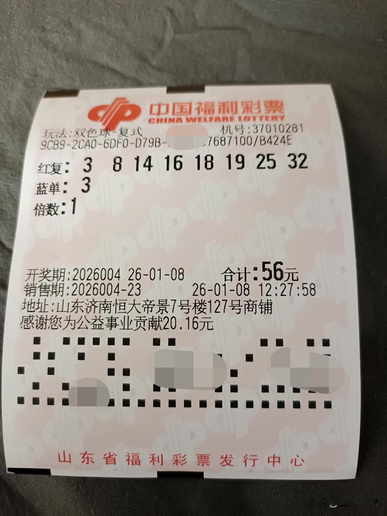 双色球2026004期开奖了,开奖号码红球:03 07 08 09 18 32,兰球:10,三连号出来了:07 08 09。 今天中午去彩票店买了一注8+1,红球只对了4个,兰球没对,只能中60块钱。 晚上七点多用手机又看了一会走势图,买了一注7+1,兰球看好10,结果出来了,只能中35块钱。 有点小郁闷呀,红球选对了5个,兰球也选对了,可惜没有组合到一起,不过没有赔钱,下期继续努力吧。 双色球 彩票双色球 双色球彩票中奖 双色球图 双色球开奖历史 双色球大底 双色球中奖记录 双色球中奖凭证 福彩双色球 双色球走势图 双色球中奖查询 双色球试玩 双色球遗漏统计 金典双色球 双色球历史数据