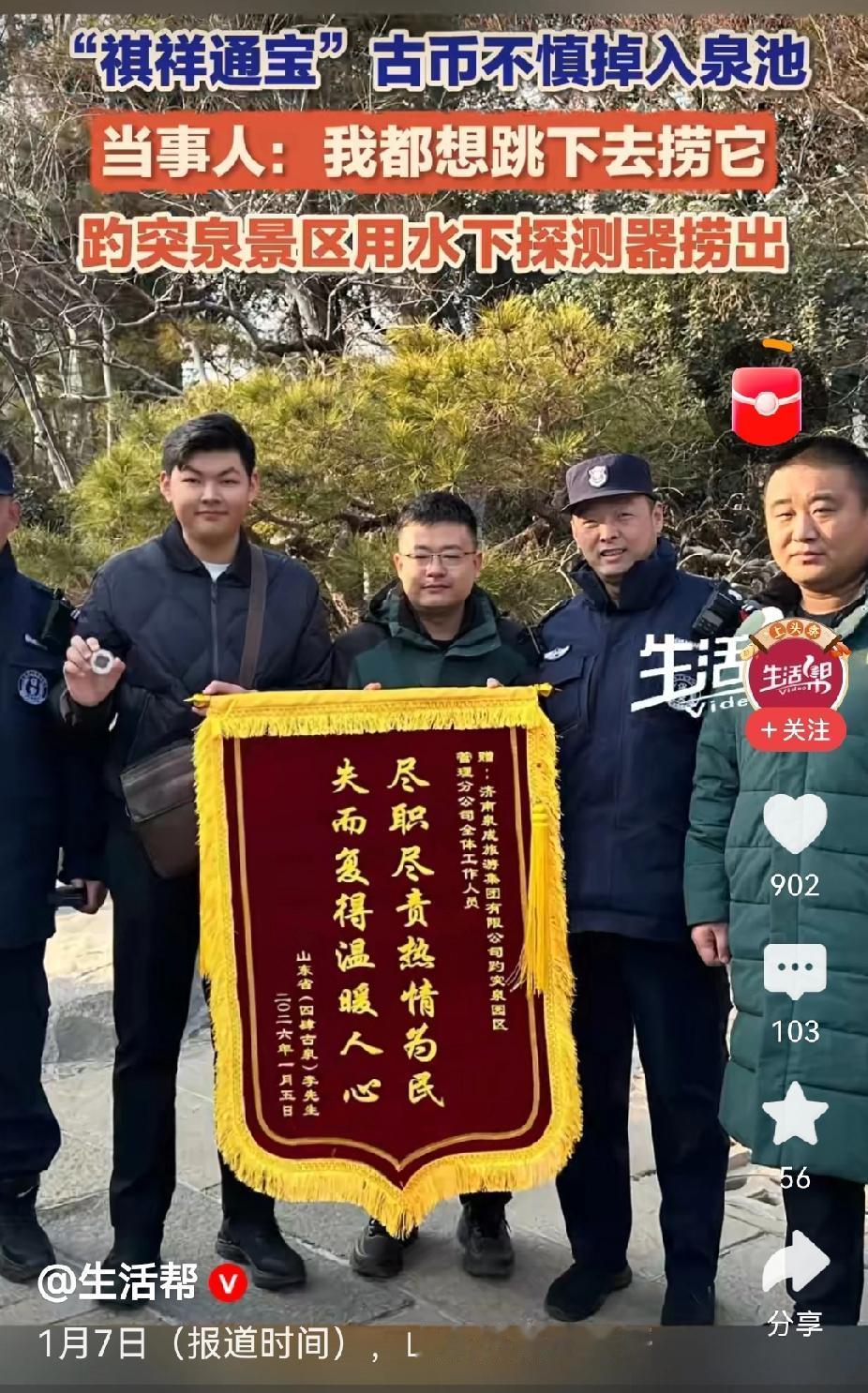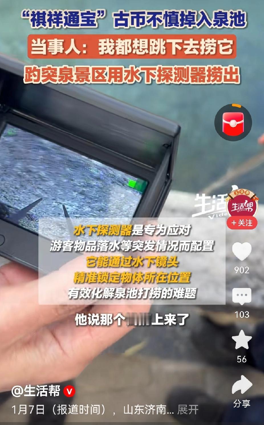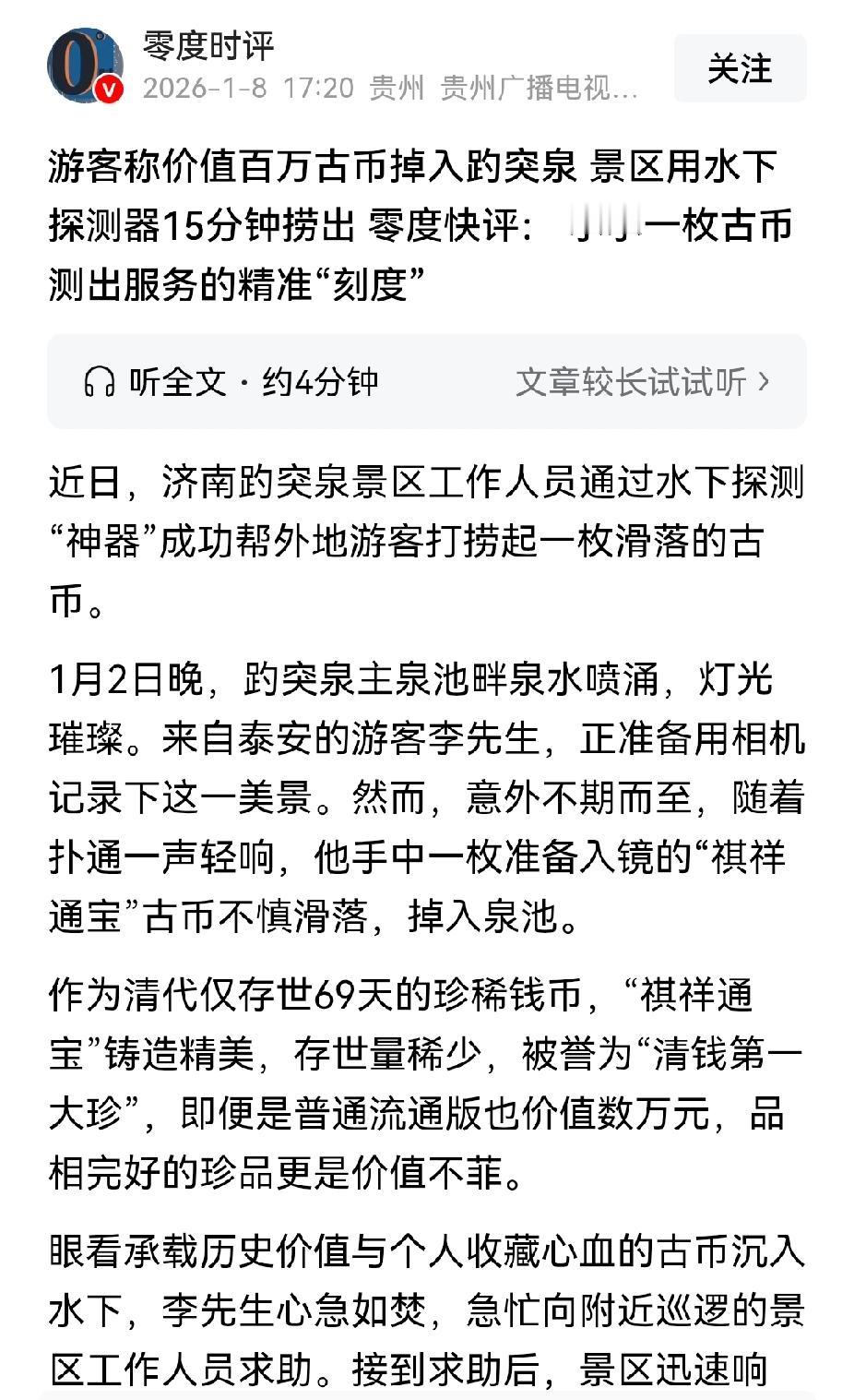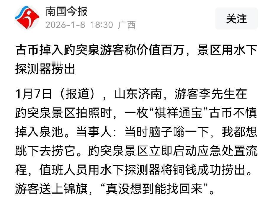 价值百万的古币掉入趵突泉被公园捞起?这很像一场炒作。 事情是这样的,一个自称是泰安游客的李先生在1月2号晚上游玩趵突泉公园时,不慎将一枚“祺祥通宝”古币掉入泉池中。当事人李先生声称这枚古钱很稀有,价值百万。李先生说当时都想跳下去捞。 随后趵突泉公园启动应急流程,用了水下探测器,将古钱成功捞出,交给李先生。李先生很高兴,给趵突泉公园送了锦旗。 光看新闻的话是个偕大欢喜的局面,但细节却经受不住推敲。 一枚当世稀有、价值百万的古钱,正常人应该是放在家中安全的地方收藏啊,谁会没事带着出来旅游?好吧,就算这个李先生愿意带出来旅游,那也应该放在身上安全的地方。然而事实就是这个李先生就将价值百万的古钱随意拿在手里,然后掉入泉池中。 这是正常人干的事情吗? 很显然,这应该是一次炒作,目的就是告诉大家,李先生手里有一枚价值百万的古钱。 那么这枚古钱到底值不值百万呢,我不懂文物不敢妄下结论。但是,哪怕价值千万,只要没变现,那就是不值钱。只有变现了,才是真正的值钱。 所以说这次炒作的概率更大,因为新闻强调的是古钱价值百万。 至于趵突泉公园方面,要么被利用了,要么还有别的原因。