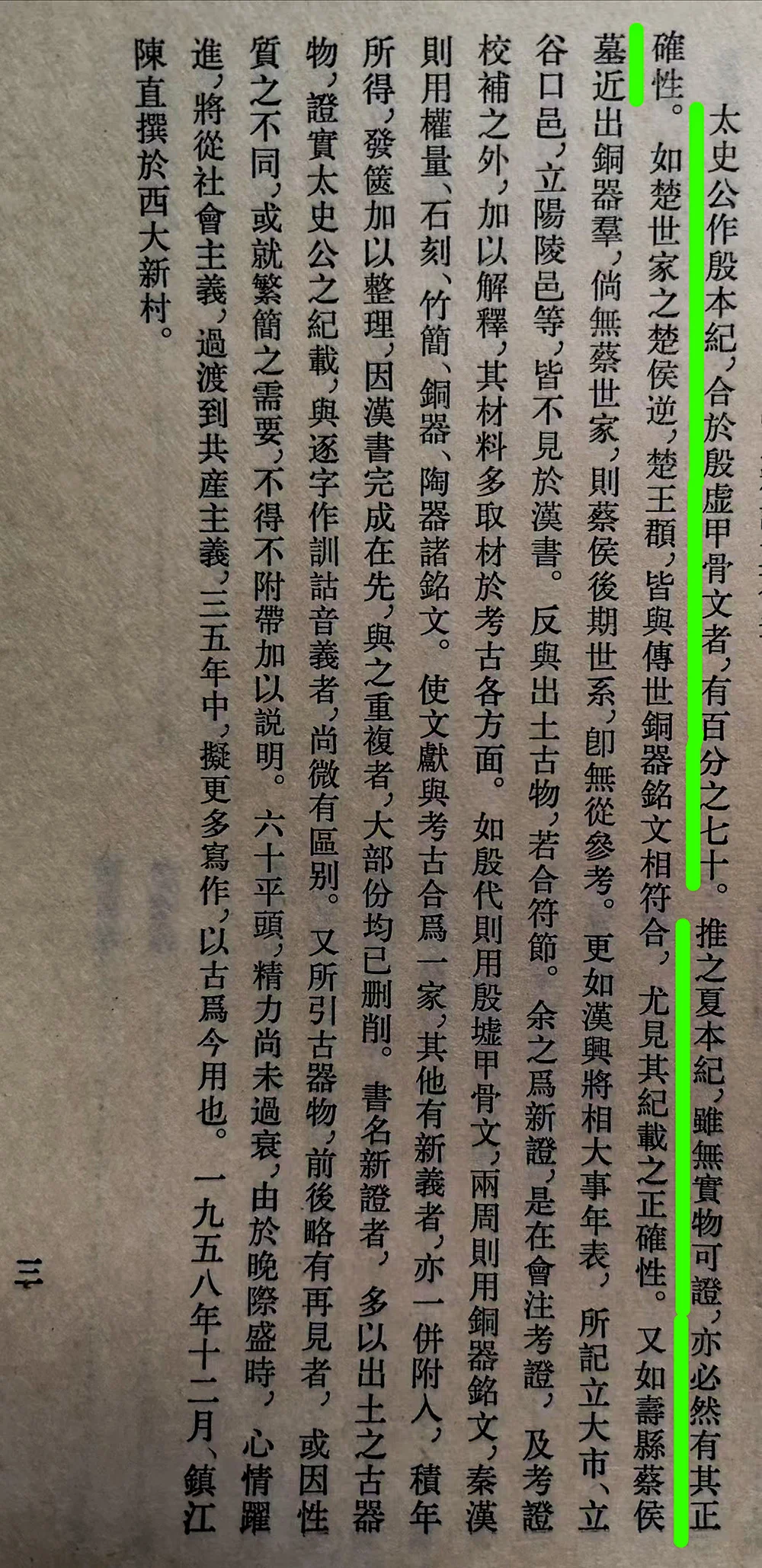 古往今来研究历史的学者对文献记载的真实性、准确性一直存在争议,经年通过罗振玉、王国维、郭沫若、李学勤等多位学者的研究、识读、释读与《史记殷本纪》商王世系七成信息是相互验证的,从而确定《史记殷本纪》是信史。著名历史学家(先秦史)陈直先生在其《史记新证》序言(图二)写道:太史公作殷本纪,合于殷墟甲骨者,有百分之七十。推之夏本纪,虽无实物可证,亦必然有其正确性。