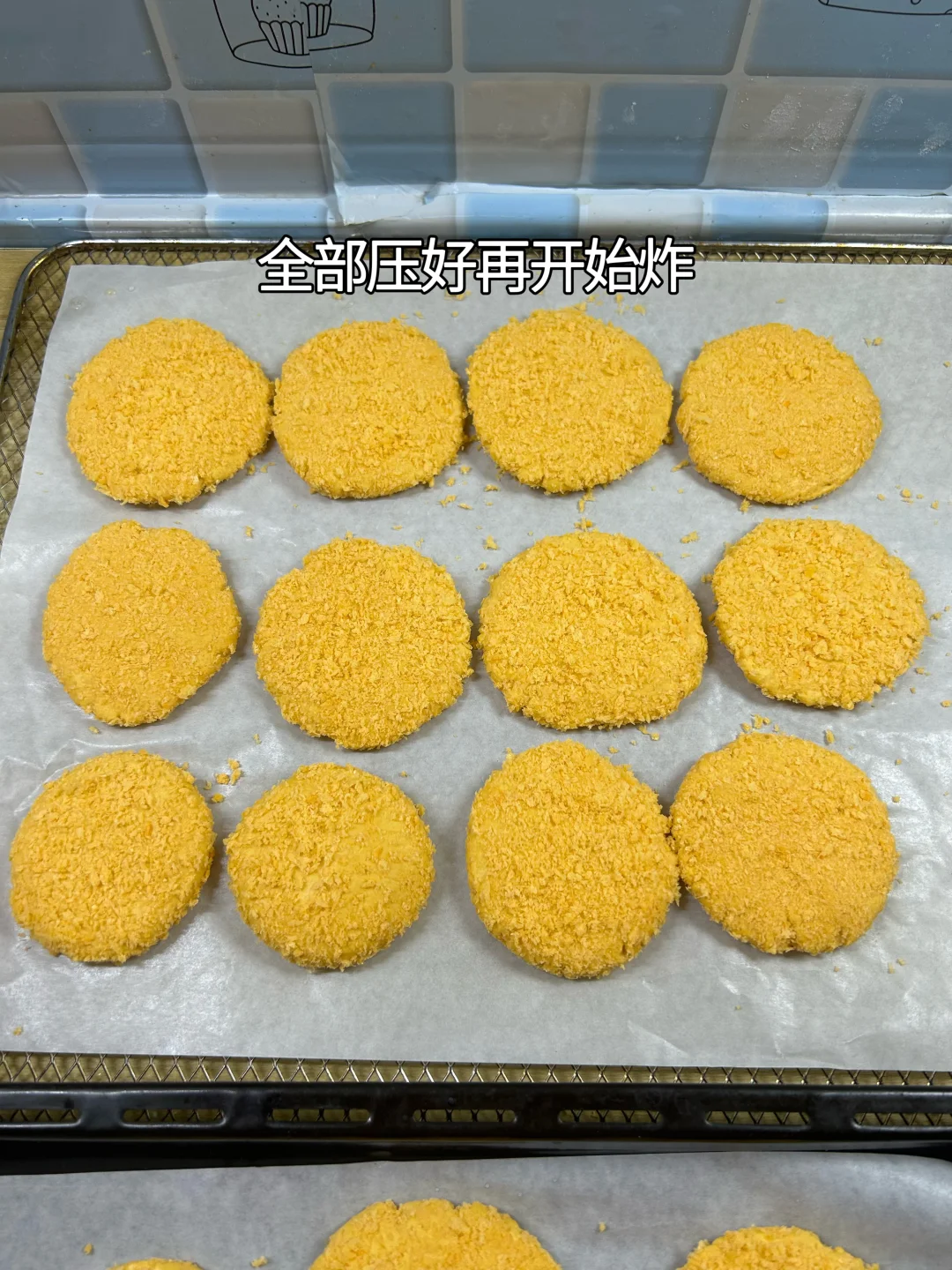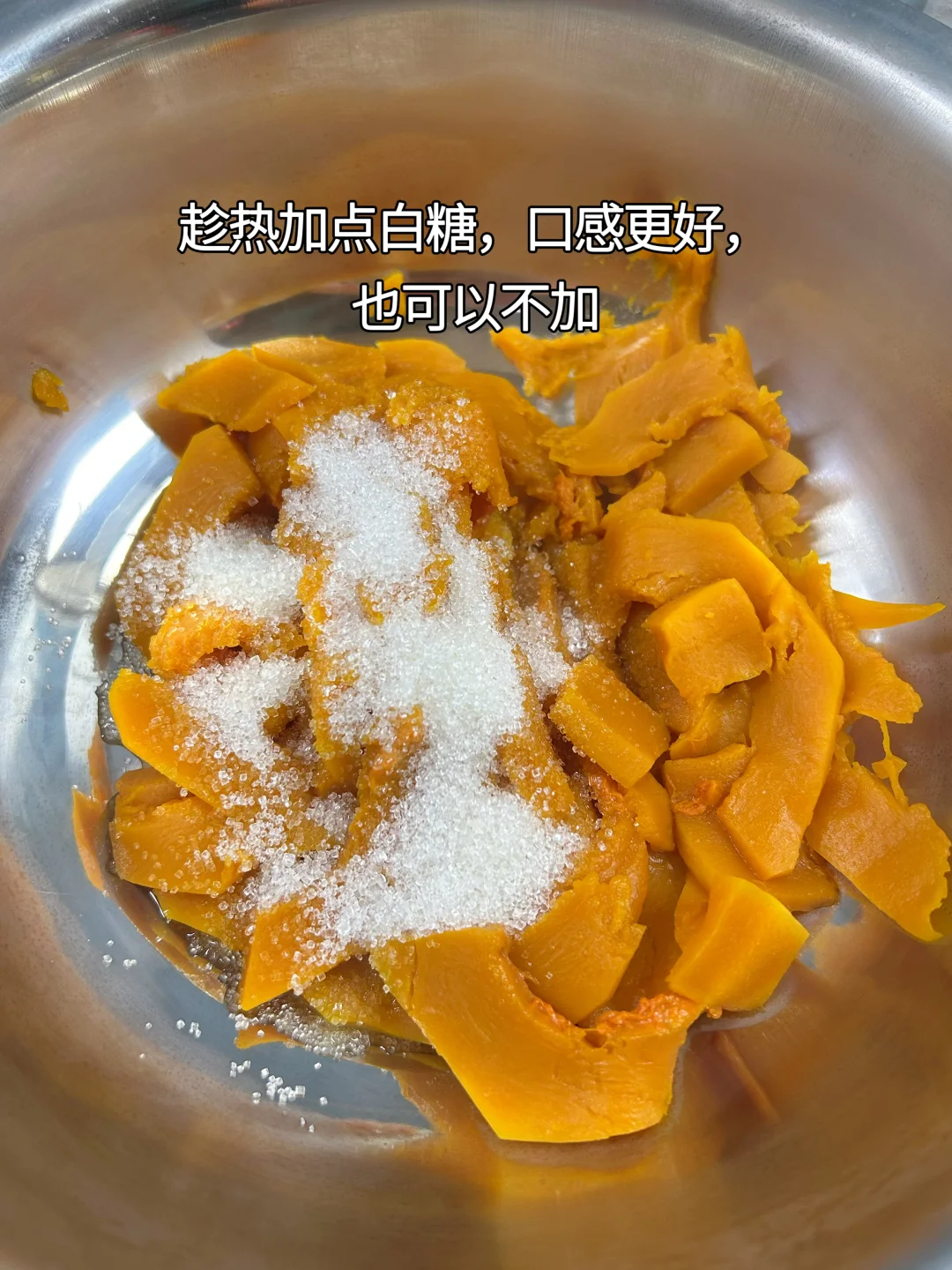 普通的南瓜食材,经过简单几步,变成人人爱吃的南瓜饼,现在正是吃南瓜的季节,周末抽空做起来。 主要材料:老南瓜,糯米粉,面包糠,食用油 步骤: 1.南瓜选用黄皮老南瓜,这样比较甜,颜色也好看。 2.去皮洗净,切薄片更容易熟。 3.上锅水开蒸15分钟到全部软烂。 4.沥掉一部分水分,这样不至于太稀。 5.趁热加适量白糖,压成南瓜泥。 6.加同等重量的糯米粉,如果太稀再加一点糯米粉,如果太干再加一点水。 7.揉成偏软不粘手的面团。 8.搓成30克一个的小球,压扁,沾清水再沾面包糠,压紧,抖掉多余面包糠。 9.油温6成热下锅,太热容易糊,太凉一直无法定型,吸油多,速度慢。 10.定型后翻面,保持中小火炸至漂起,再炸一两分钟就好了。想更酥脆可以多炸一下。 外皮金黄酥脆,里面软糯拉丝,趁热吃真是又香又甜,一人吃一两个就好,好吃也不要贪吃哦。