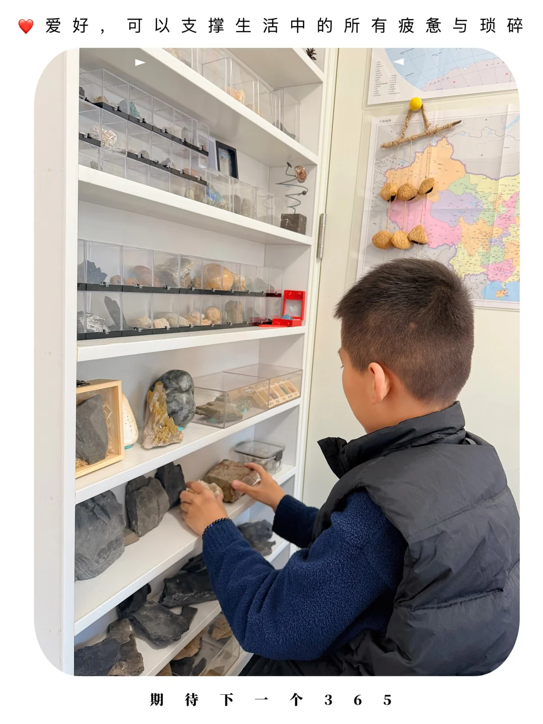 而他收藏的石头也越来越多 —— 小翼爸爸不得不为他新装了一个标本柜,里面整整齐齐地码着他从雁荡山带回来的球泡流纹岩、从黄山带回来的花岗岩、从庐山和敬亭山带回来的石英和方解石……