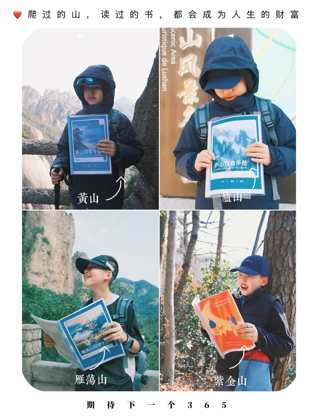 每爬一座山,我都会提前给他做一本研学手册,打卡“三山”就做了三本~