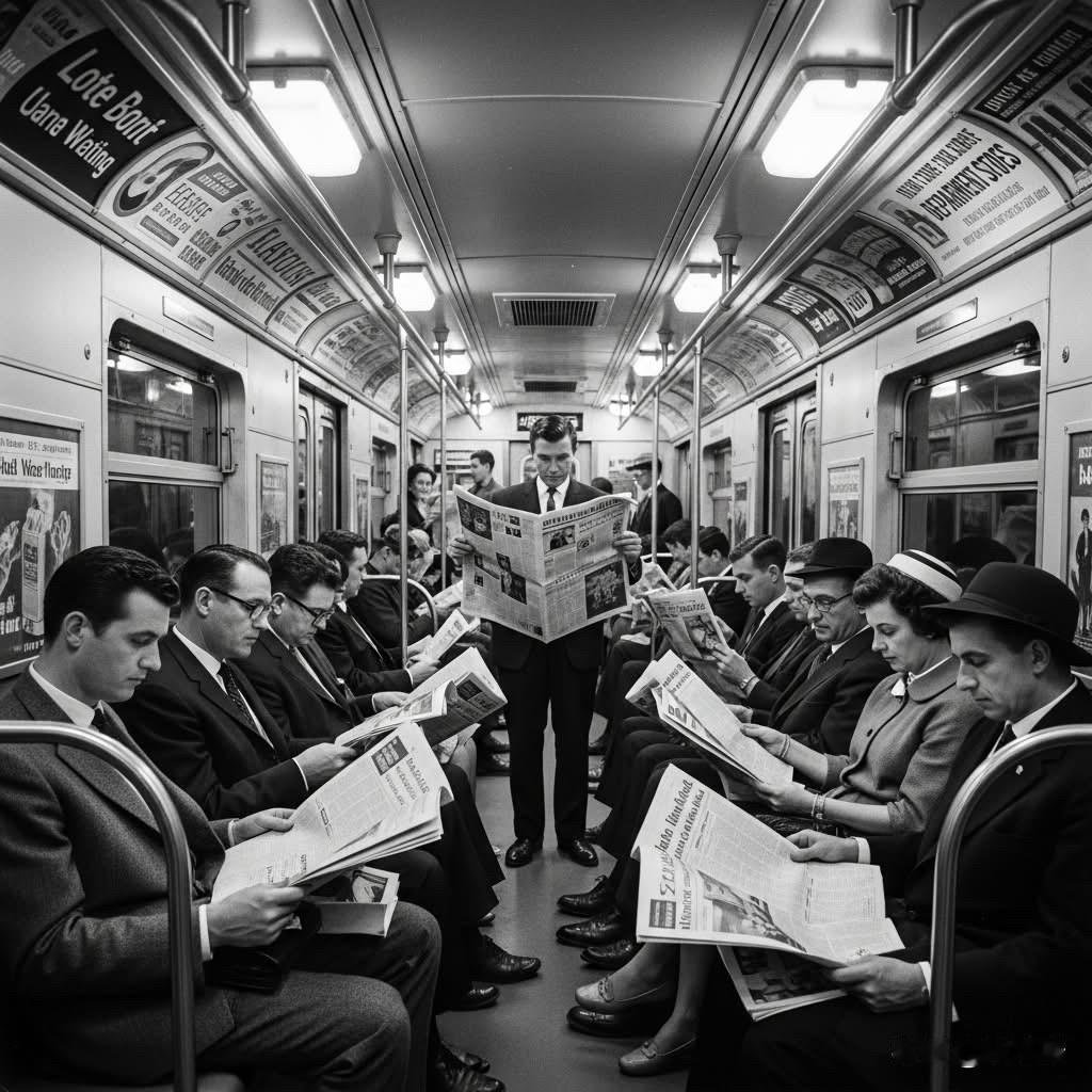 这张照片是美联社摄影师 Jacob Harris 拍摄的著名历史照片,名为《通勤者在纽约地铁上阅读晨报》(Commuters read their morning newspapers aboard the New York City subway)。 该照片于 1963 年 4 月 1 日 拍摄,正值纽约市长达 114 天的报纸罢工刚刚结束。在此期间,乘客们因没有报纸可读,通常会盯着车厢广告或发呆,而这张照片则展示了印刷媒体恢复供应后,人们恢复日常通勤习惯的场景。 地点: 纽约市地铁车厢内。 照片捕捉了日常通勤生活中一个安静、几乎电影般的瞬间。大多数乘客都沉浸在阅读报纸中,这在当时是一种常见的社交活动,反映了印刷媒体在日常公民话语中的核心作用。 这张照片经常被用来与现代智能手机普及后的地铁场景进行对比,说明尽管技术在变,但人们在公共交通工具上沉浸在个人世界或获取信息的习惯是相似的。