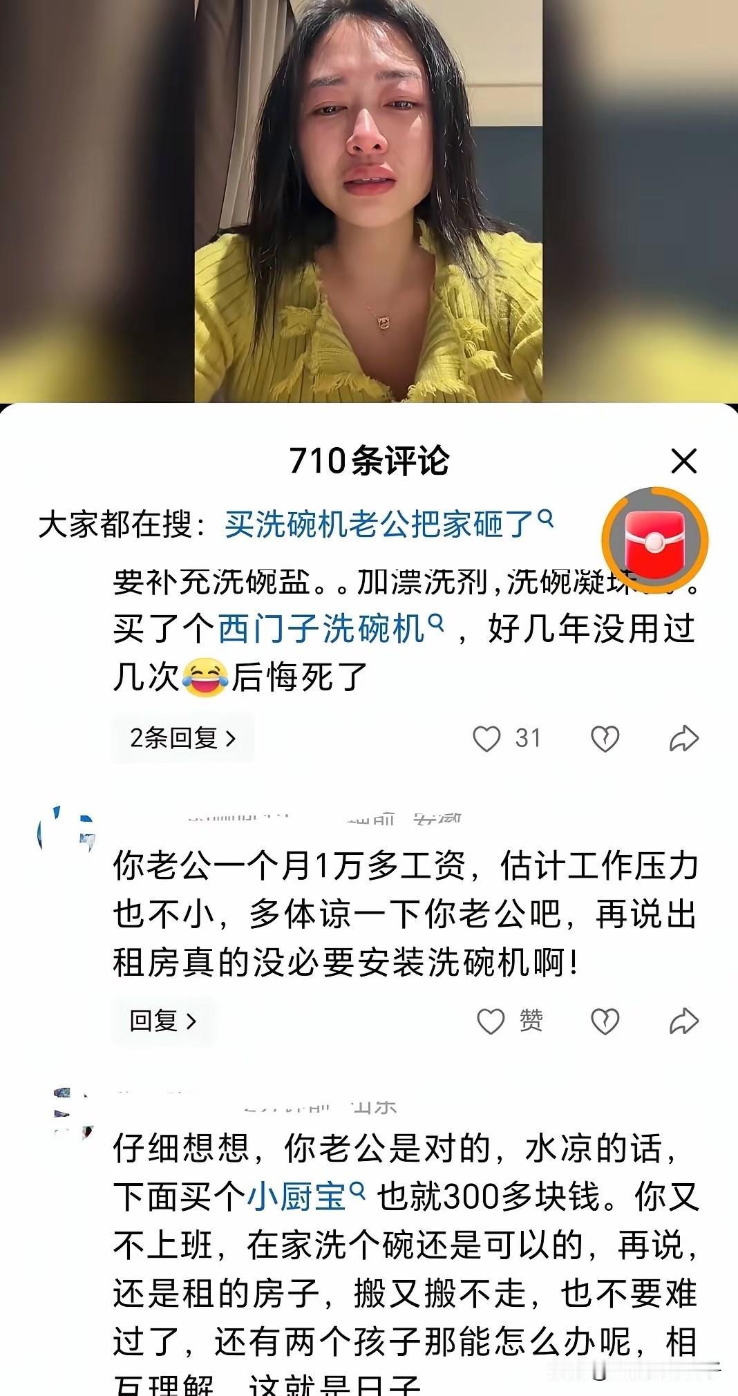 替1500元洗碗机女生不平!洗碗机不是包包! 真实感受!别说什么都很辛苦?省着点之类的话。 第一,不管如何,不应该打摔东西,这么暴躁,这脾气,我不敢说你老公对你有多好。 第二,家庭也是一般家庭,租房住,还有外债,这不是所有现在年轻人的通病和现状吗?难道这样就不能消费了? 第三,女生,尤其小女生很在意的就是脸和手。现在就天天洗碗,手再年纪大点就不能看了。 第四,1500元的洗碗机,对于平时工资在10000元来说,这个是很昂贵的东西?又不是包包?化妆品? 这样憋屈,两个人在一起早晚出问题。