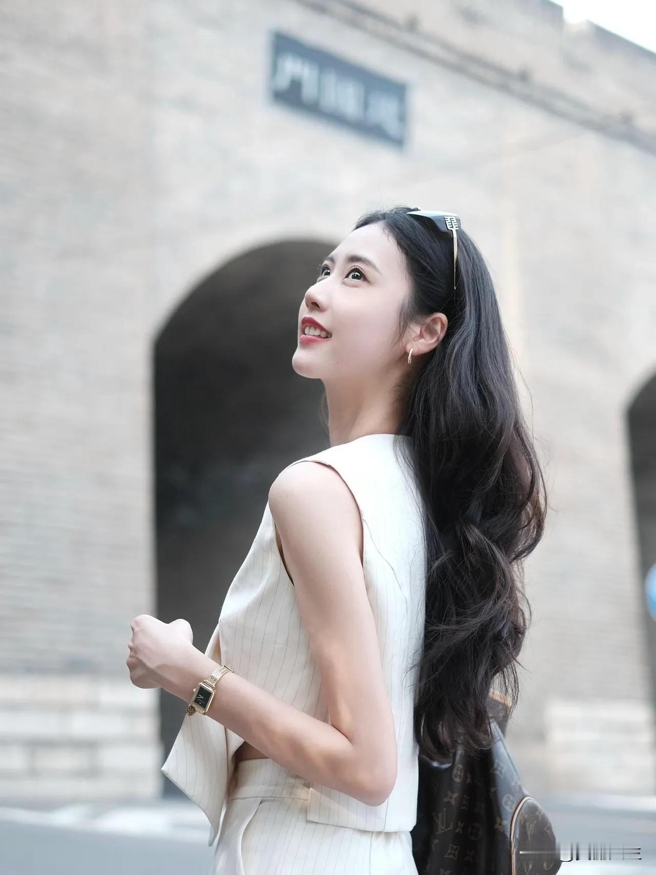 在古镇的石桥上,优雅地坐着,享受宁静的时光。