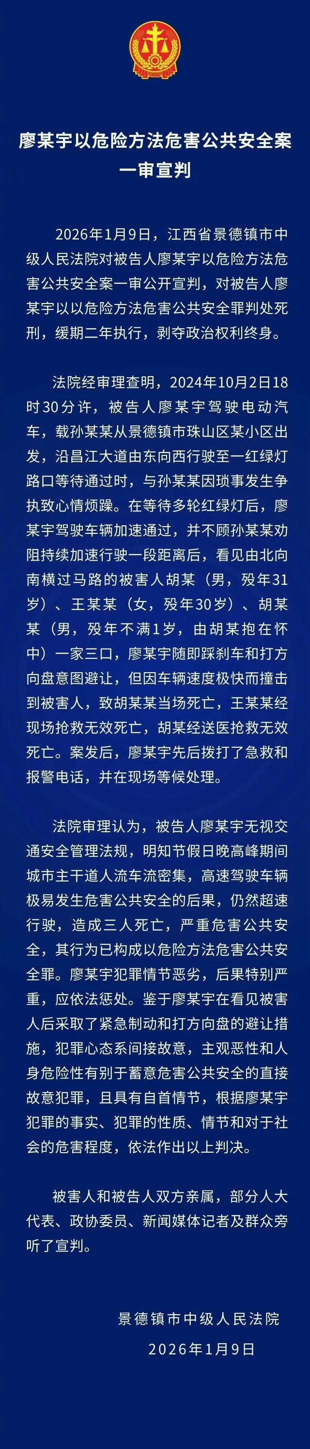 来看看廖某宇在撞死景德镇一家三口之后,他和他的家人都做了什么,如果这样都觉得判决死缓合理的话,那真的挺悲哀的! 廖某宇在事故发生后,120抢救伤者时,他竟在一旁抽烟,玩手机,警方带他抽血时,其仍在玩手机、联系朋友,一个婴儿头身分离,他竟冷血调侃“小孩头真硬”。 受害者胡某夫妇均为独生子女,婴儿是家族唯一孙辈,廖父曾提出80万赔偿+廖某宇出狱后养老方案,被胡母严词拒绝,更是称惨案是天灾,指责受害者追责为人祸,甚至威胁让你们家死干净,不止一次的在受害人家属心里捅刀子。甚至在网上被曝光后,还反过来指责受害者家属炒作、博同情,将自己塑造成被逼无奈的受害者。 案发460多天内,受害者家属未收到一句正式道歉,庭审中廖某宇虽曾承认交通肇事罪,但始终辩解并非故意酿成惨剧,仅在庭审结束前向受害者家属鞠躬致歉。 这轻飘飘的一鞠躬,抵得过三条鲜活的人命?一个能在血泊旁谈笑风生、拿婴儿的惨状当玩笑的人,真的会有“悔意”?一个漠视生命到极致的人,一个毫无悔意、家属还在持续伤害的人,凭什么能保住性命? 法律的底线是惩戒罪恶,更是抚慰人心。如果一场造成灭门惨案的犯罪,只换来死缓的结局;如果凶手的冷血、家属的嚣张,都能被“间接故意”“自首情节”轻轻带过,那法律的公平正义,又该如何体现?那些逝去的生命,又该如何安息? 这不是一句法律自有公断就能敷衍的。当受害者家属的诉求被忽视,当凶手的恶行被酌情轻判,我们不得不悲哀地发问:这样的判决,到底是在警示后人,还是在纵容罪恶?