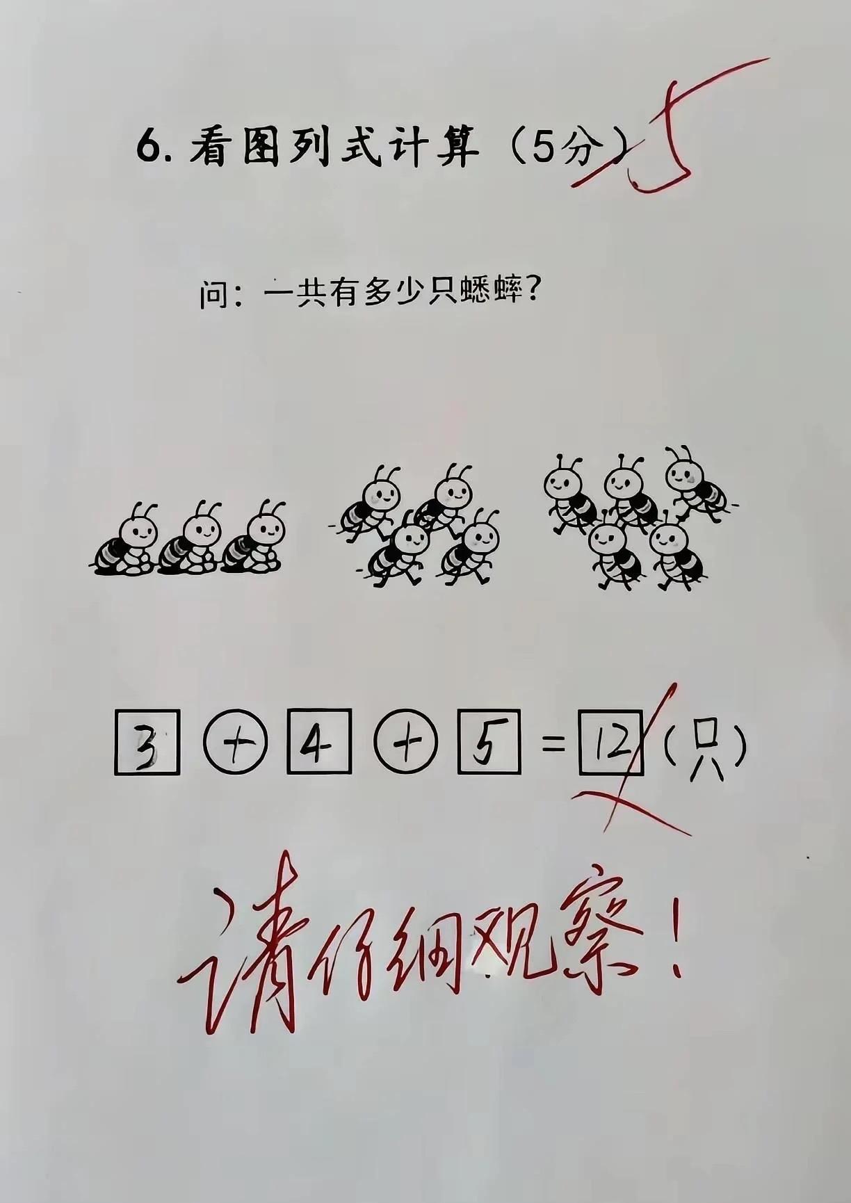 今天丢人丢大了,一年级的数学题都看不明白,有三堆蟋蟀,第一堆是3只蹲在原地,第二堆是4只在往远处走,第三堆是5只在往原地来,要求列式计算共有多少只蟋蟀。 有一个小朋友的列式是这样的:3+4+5=12(只),老师判这条题做错,被扣掉了5分,我看不明白错在什么地方。 我继续思考,认为正确答案应该是以下几个当中的一个: 1:图里面都是蚂蚁,没有蟋蟀,答案应该是0+0+0=0(只) 2:原来有7只,走了4只,又来了5只,7-4+5=8(只) 3:跑走的4只,碰到了新来的5只,进行了一场恶战,结果是两败俱伤,只有一只来到了原地,3+5-4=4(只) 有没有人知道哪一个序号的计算是正确的,或者是你认为正确的算法应该是什么?