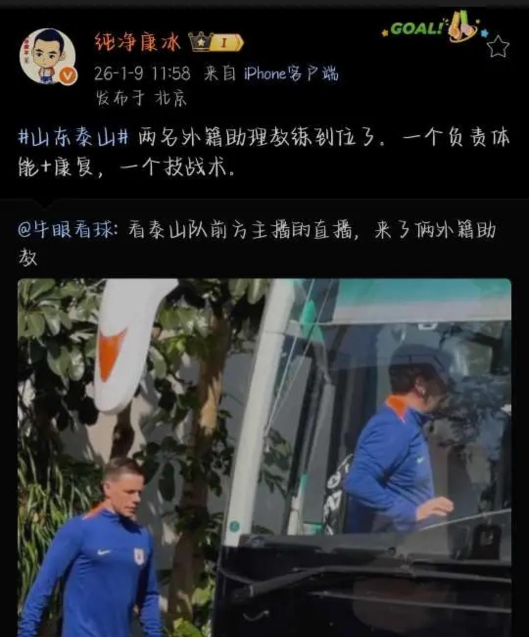 山东泰山队来新人啦! 球迷直言期盼已久! 目前球队已经在海口开启了冬训,除了大家熟悉的老面孔,有球迷拍到球队教练组来了两位新的外籍助理教练。 而这一消息也得到了泰山球迷会长的肯定,他表示两位助理教练,一个是负责体能和康复,另一个则是负责技战术尤其是定位球方面。 两人的加盟或许会给泰山队带来不小的帮助,一方面,新助教的到来,可以帮助泰山队优化战术和定位球设置,补足已经暴露了两三个赛季的短板。而另一位助教则可以帮助球员完善体能训练,加强球员的身体康复管理。