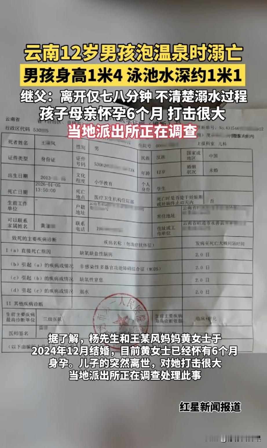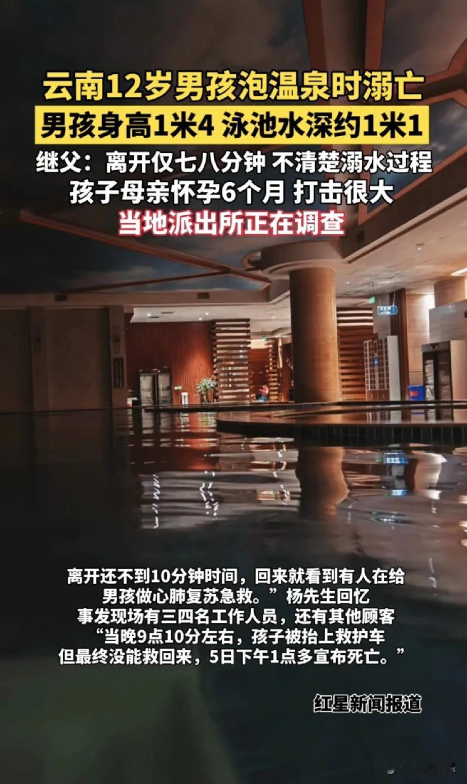 云南昭通这事儿真的让人越想越难受:12岁男孩身高1米4,在才1米1深的温泉池里溺亡了,而且孩子还套着游泳圈,继父就离开七八分钟去冲个澡,回来孩子就没了呼吸。 事发在当地紫光世纪温泉,1月3号晚上,男孩跟着继父去泡温泉,继父看水浅,又给孩子套了游泳圈,就放心去隔壁淋浴间了。可就这短短几分钟,意外突然发生。等继父回来,看到有人正给孩子做心肺复苏,当晚孩子被送医,还是在1月5号下午没抢救过来,死因是溺水引发的缺氧缺血性脑病。 更让人揪心的是,男孩妈妈已经怀孕6个月,夫妻俩去年12月刚结婚,这个家一下子就塌了。而涉事温泉方只愿意赔20万,还照常营业,面对采访也躲着不回应。现在派出所和应急管理部门都介入调查了,但孩子的命再也回不来了。 说真的,这事儿最让人想不通的就是“看似安全”反而藏着大隐患。孩子比水深高30厘米,还有游泳圈防护,可温泉水热容易让人头晕抽筋,浅水区也能出致命意外。家长总觉得“离开一会儿没事”,场所方也觉得“有工作人员在就行”,可儿童溺水往往就发生在几十秒里,根本容不得半点疏忽。 作为家长,孩子在水边的时候,视线真的一秒都不能挪开,别仗着水浅、有浮具就掉以轻心。而温泉这种场所,安全巡查和救生措施也绝不能当摆设,不然再多的赔偿,也换不回一个孩子的生命啊。