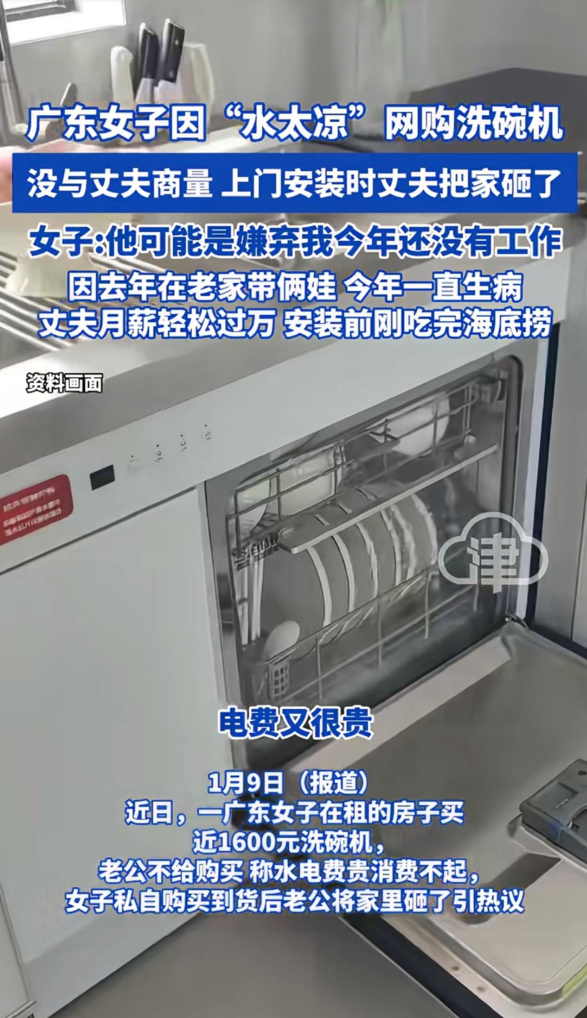 这事儿可太有看头了!1月7日广东这对夫妻,就为个洗碗机闹得鸡飞狗跳。妻子没和丈夫商量,花1500多元偷偷买了洗碗机,丈夫得知后让退掉,说费用大,水电用不起。可妻子理解不了。 丈夫月薪一万多,但妻子今年生病没工作,全家靠他一人养。妻子还趁丈夫加班让师傅安装,丈夫回来直接砸东西发泄。不过没砸贵东西。最后妻子申请退货了,不然丈夫说全砸烂。这说到底,还是夫妻沟通出了问题,买东西还是得商量着来,不然好好的家,因为个洗碗机闹成这样,多不值当。