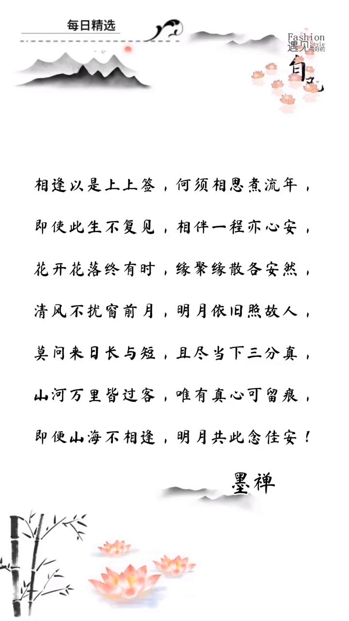 每日精选。 相逢以是上上签,何须相思煮流年。即使此生不复见,相伴一程亦心安。花开花落终有时,缘聚缘散各安然。清风不扰窗前月,明月依旧照故人。莫问来日长与短,且尽当下三分真。山河万里皆过客,唯有真心可留痕。即便山海不相逢,明月共此念佳安!