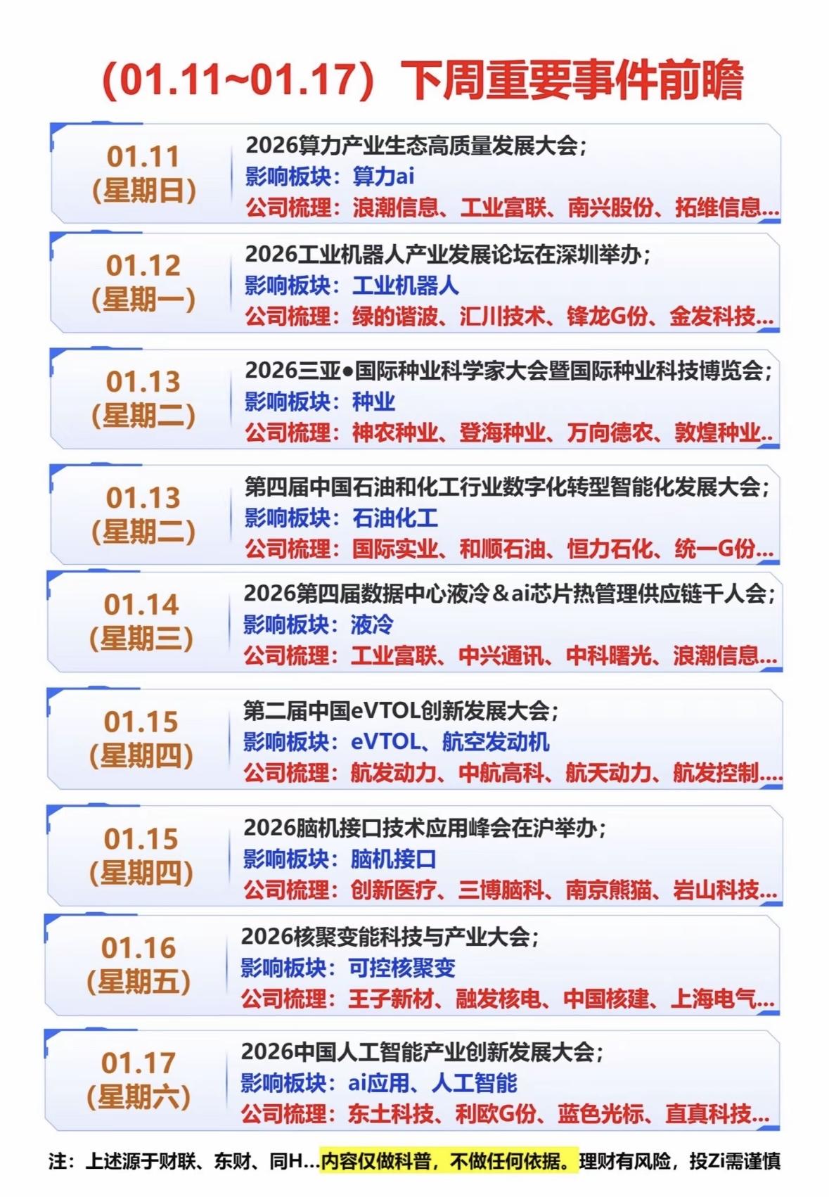 1月11日至1月17日下周重要事件前瞻 下周科技盛会密集:算力AI、工业机器人、种业、液冷、脑机接口、核聚变等板块轮动,相关龙头公司引关注。投资需谨慎。