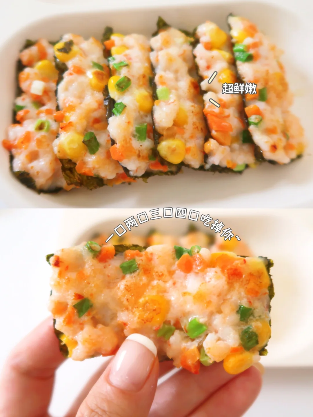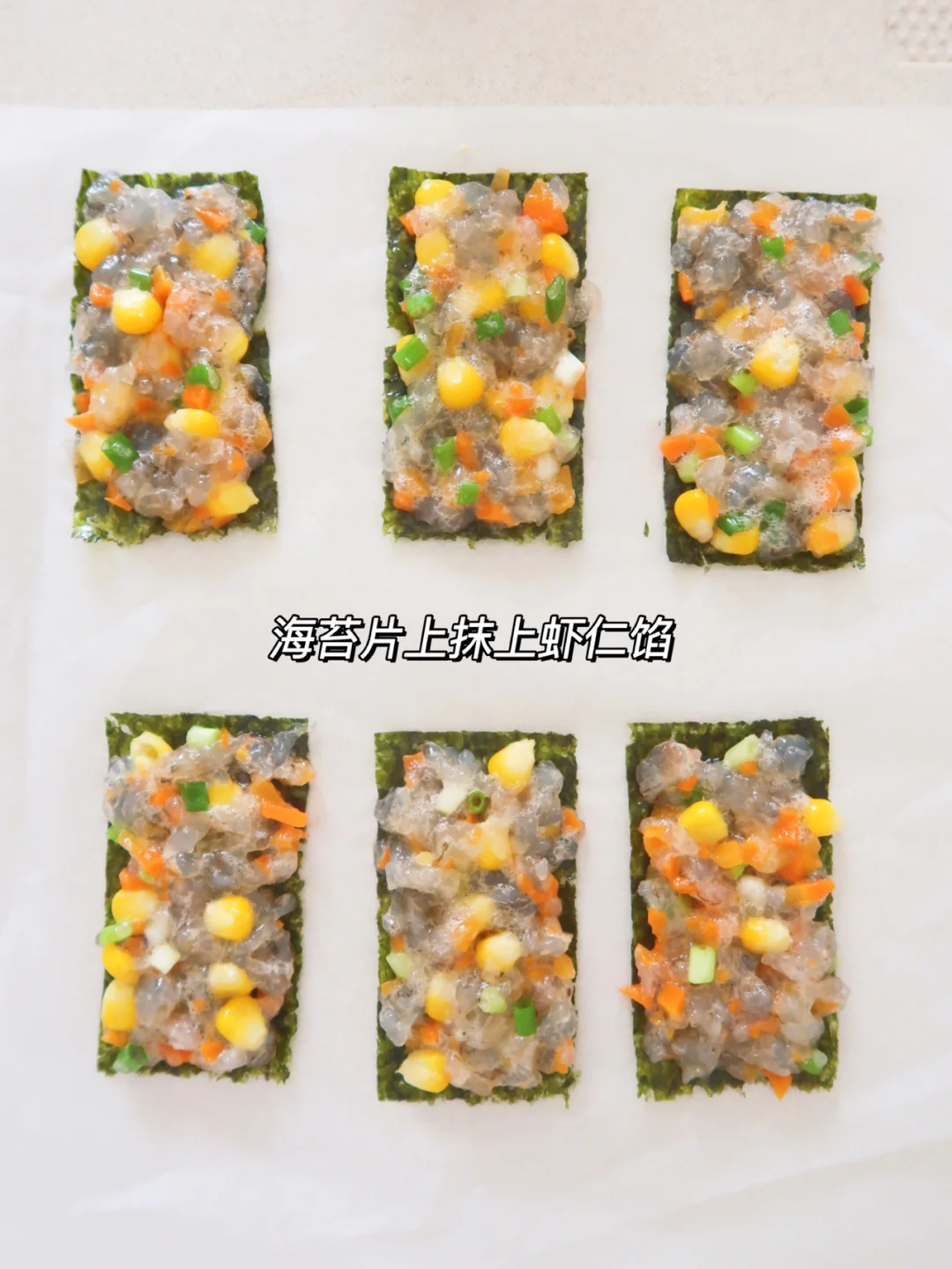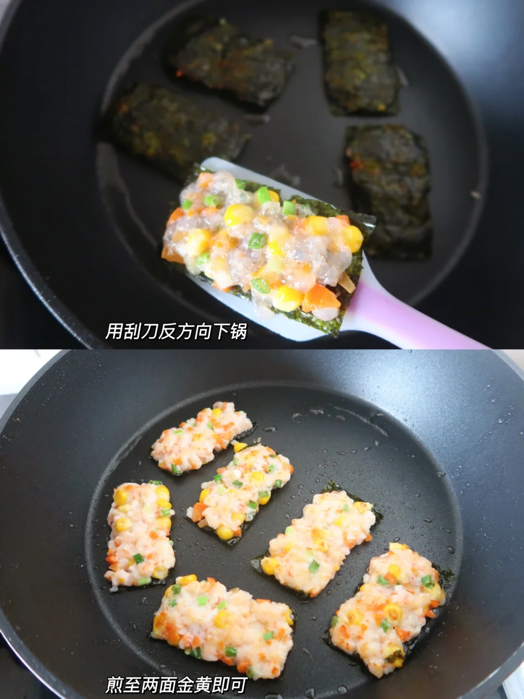作为吃虾大户,这款辅食月亮少不了,味道真的很棒,适合一岁以上的宝宝,如果小一点的宝贝就把食材弄的再小,不放调料就行,很适合孩子抓着吃,我吃了两个也觉得很嫩很鲜,妈妈们可以安排给宝贝们~ 食材: 新鲜虾100克 玉米10克 胡萝卜20克 玉米淀粉3克 蛋清一个 香葱少许 制作过程: 1、新鲜虾仁去壳去虾线打成泥,胡萝卜玉米焯水切成丁 2、所有食材加入到虾仁里,再放入调味品搅拌均匀 3、用油纸铺上,把海苔片放在上面,然后用勺子抹上虾仁馅均匀 4、热油下锅,用刮刀反面下锅,煎至金黄色反面熟透即可