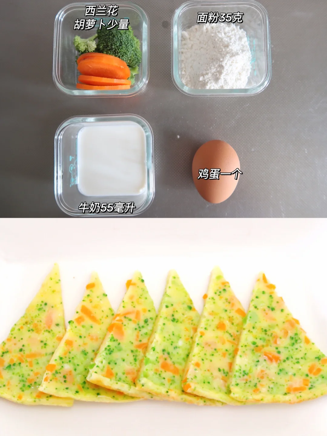 食材:西兰花胡萝卜少许,面粉35克,牛奶55毫升,鸡蛋一个