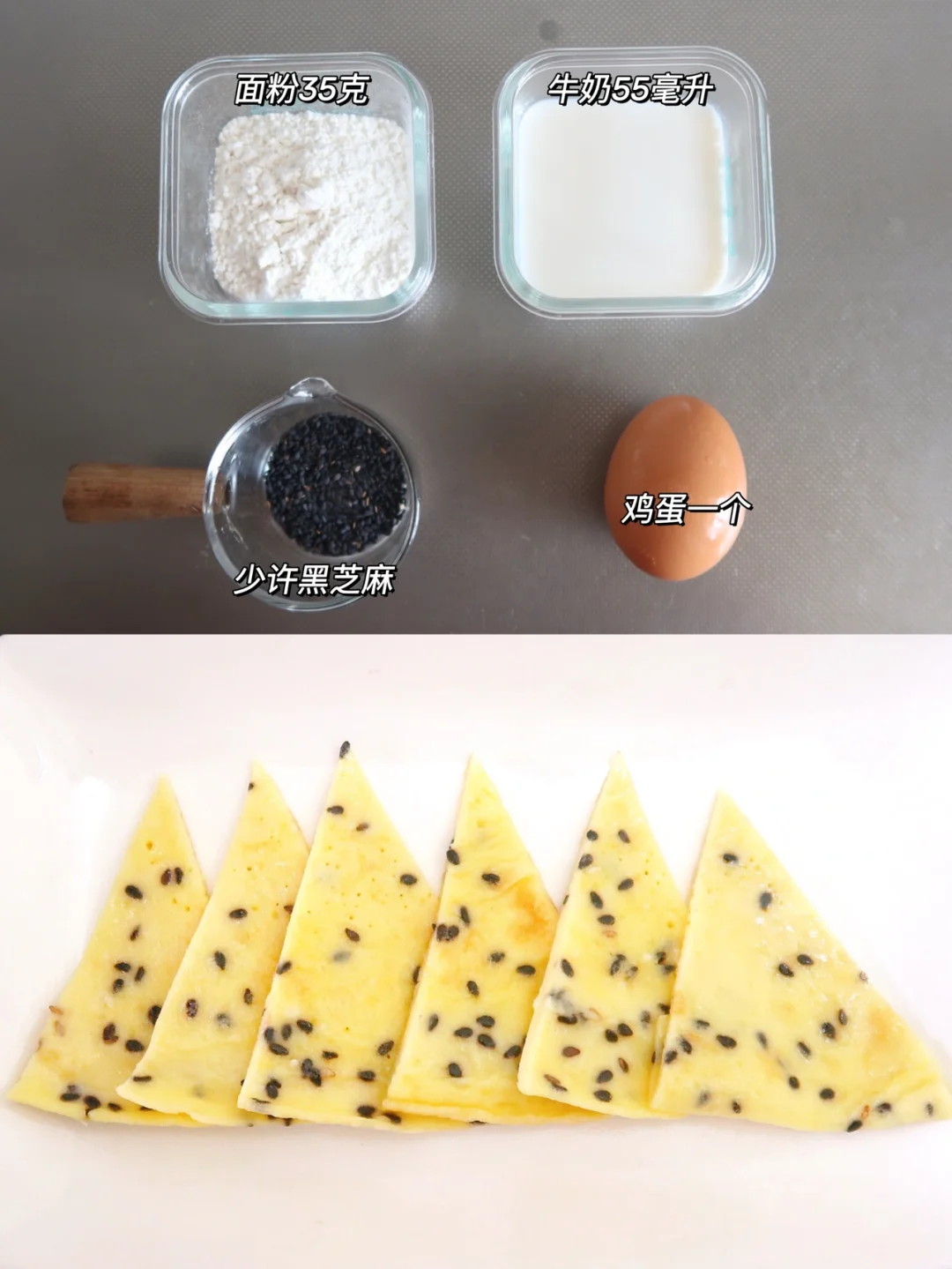 食材:面粉35克,牛奶55毫升,少许黑芝麻,鸡蛋一个